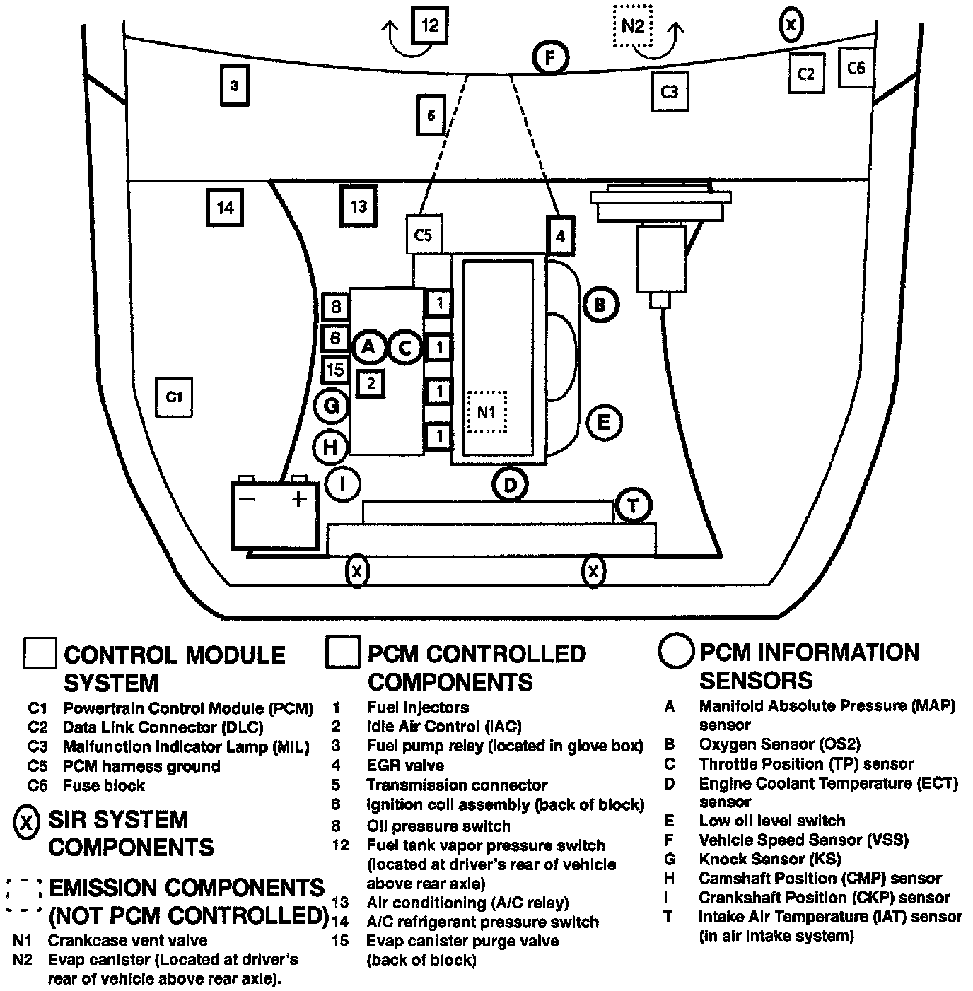 NOTE: There are many components used to control fuel and emissions. The "Component Location" view shows all emission systems that may be used for the particular vehicle/engine combination. Not every vehicle requires all the systems or the components shown, but only the ones needed to meet emission standards for the area of certification.