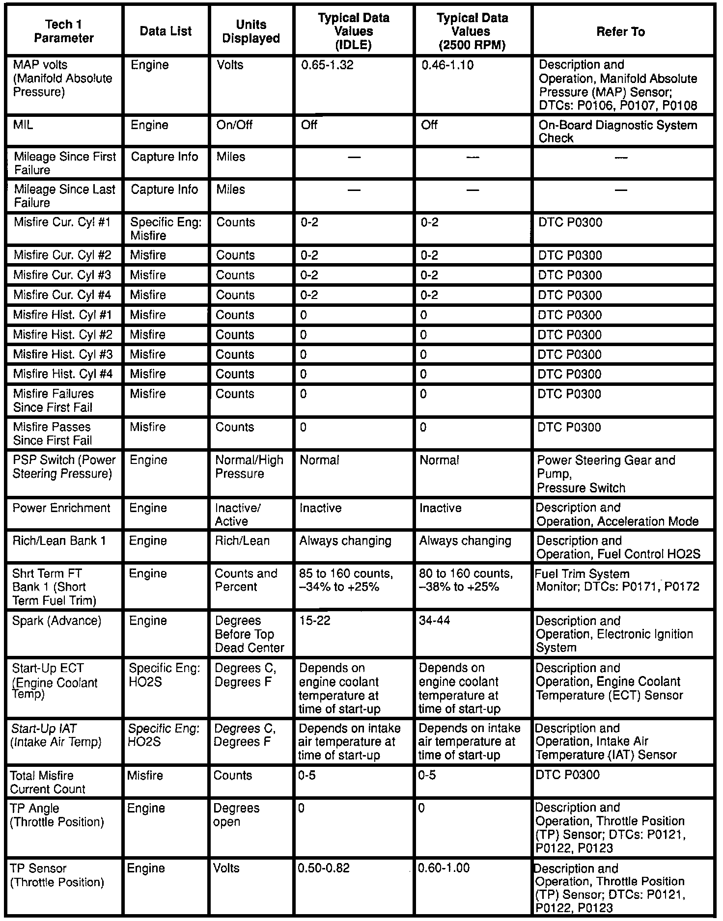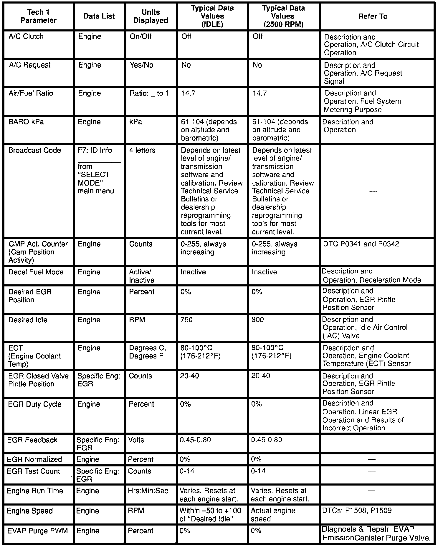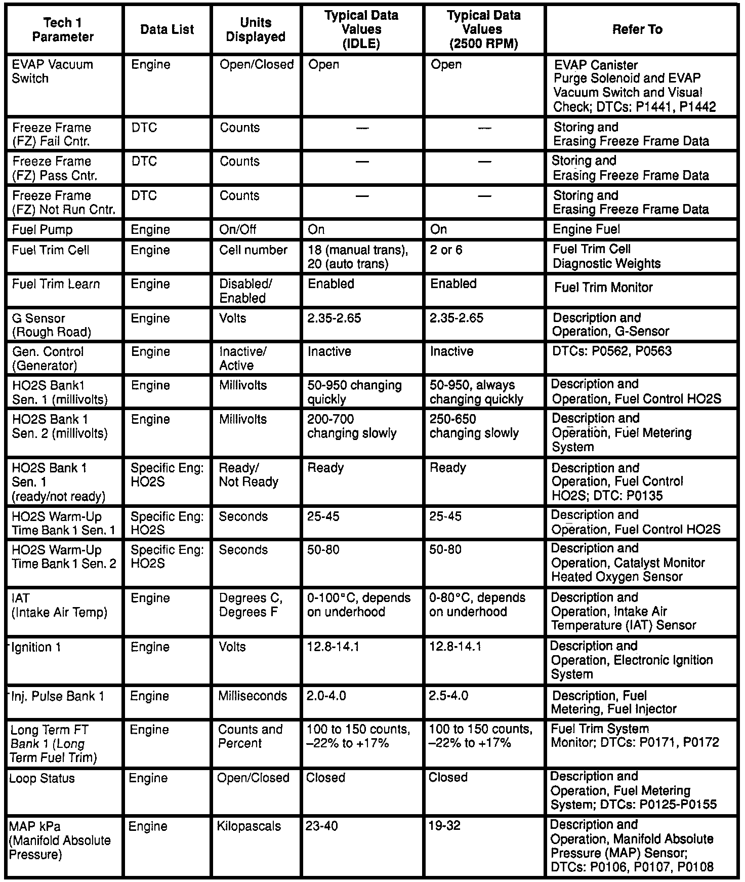 Use the Typical Scan Data Values Table only after the On-Board Diagnostic System Check has been completed, no DTC(s) were noted, and you have determined that the on-board diagnostics are functioning properly. Scan tool values from a properly-running Engine may be used for comparison with the Engine you are diagnosing. The typical scan data values represent values that would be seen on a normally-running Engine.
