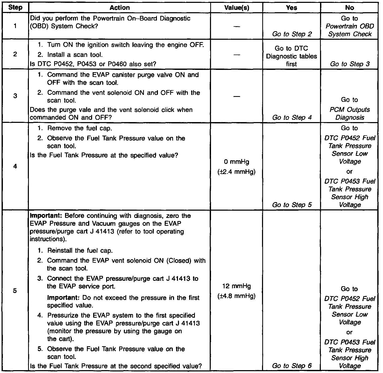 Applying a vacuum to the EVAP system and monitoring for a vacuum decay checks the evaporative emission system. The Control Module monitors the vacuum level through the fuel tank vacuum sensor signal. At an appropriate time, the EVAP canister purge valve and the EVAP vent solenoid turn ON, allowing the engine to draw a small vacuum on the entire evaporative emission system. After the desired vacuum level has been achieved, the EVAP canister purge valve turns OFF, sealing the system. A leak is detected by monitoring for a decrease in the vacuum level over a given time period, when all other variables remain constant. A leak, a blockage or a malfunctioning component in the system causes a DTC to set.