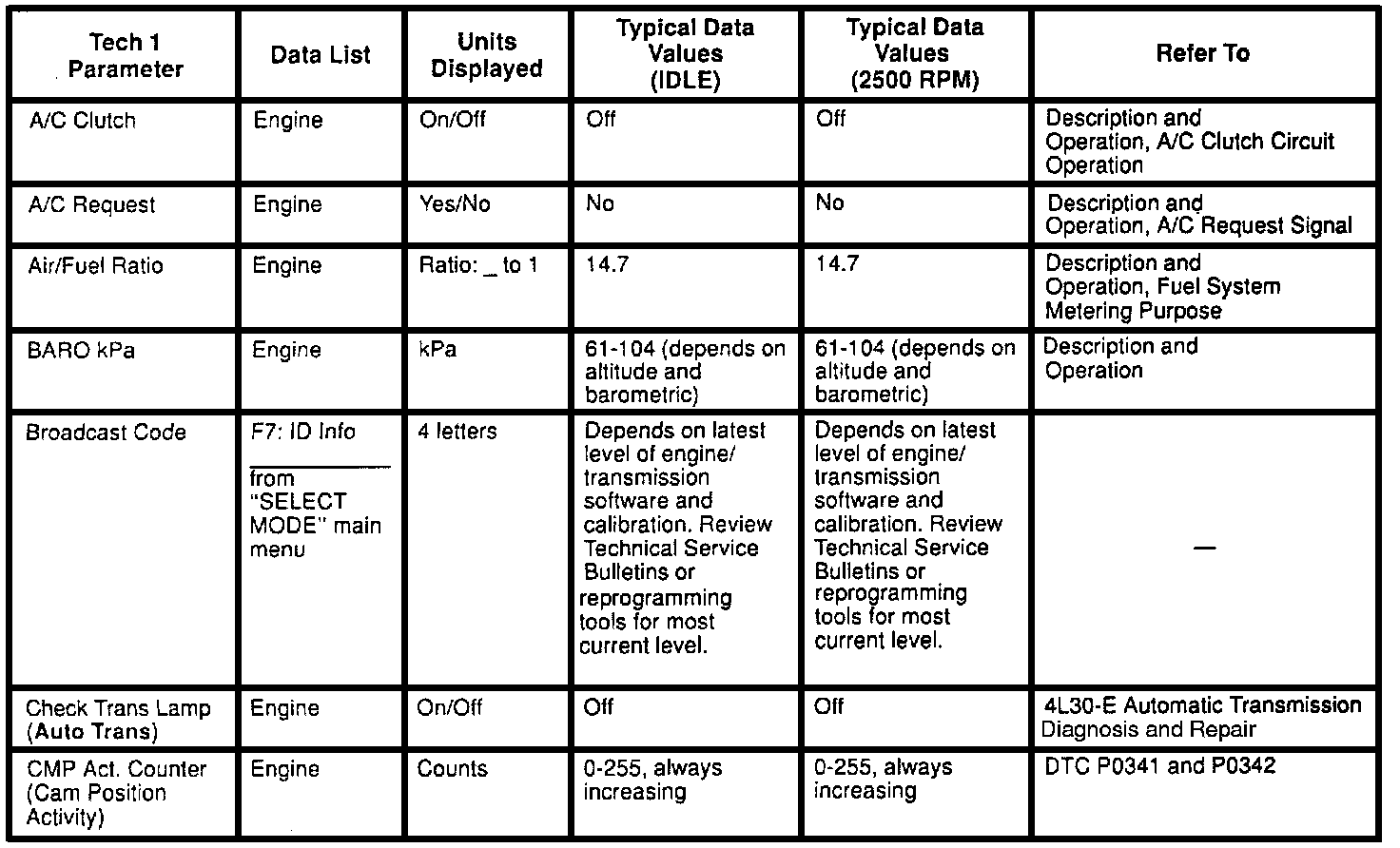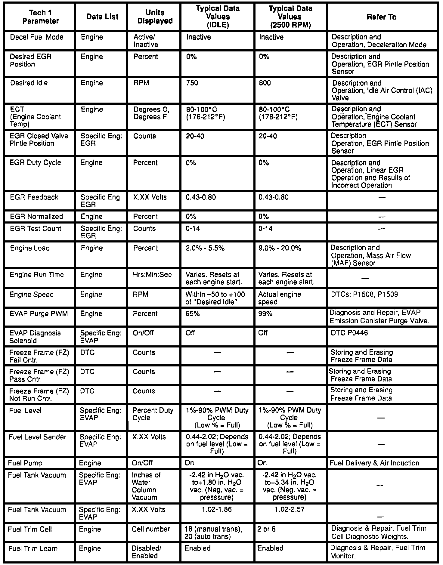 Use the Typical Scan Data Values Table only after the On-Board Diagnostic System Check has been completed, no DTC(s) were noted, and you have determined that the on-board diagnostics are functioning properly. Scan tool values from a properly-running Engine may be used for comparison with the Engine you are diagnosing. The typical scan data values represent values that would be seen on a normally-running Engine.