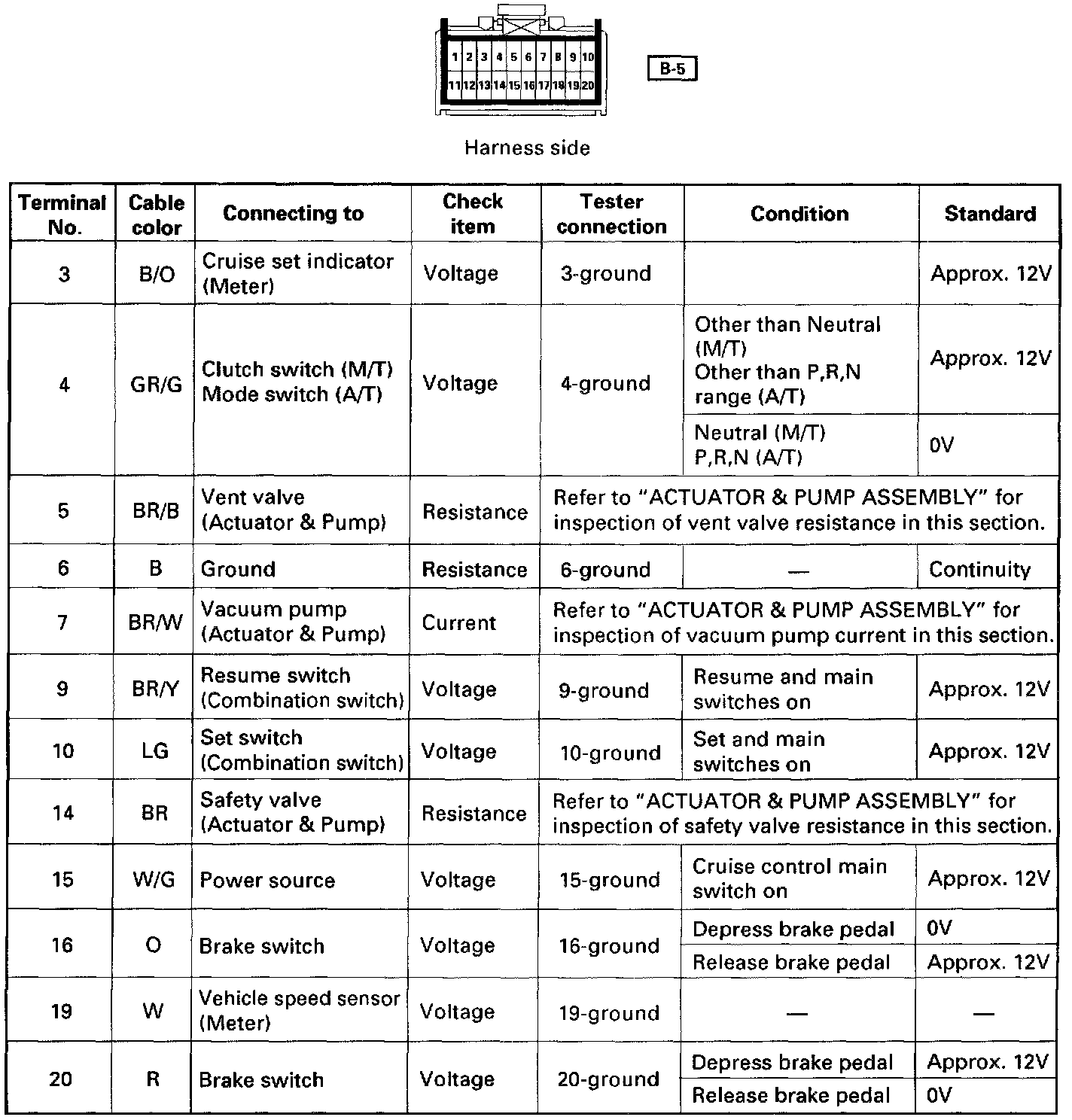 Disconnect the cruise controller connector and inspect with harness side connector.