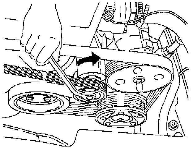 7. Move drive belt tensioner to loose side using wrench then install drive belt to normal position.