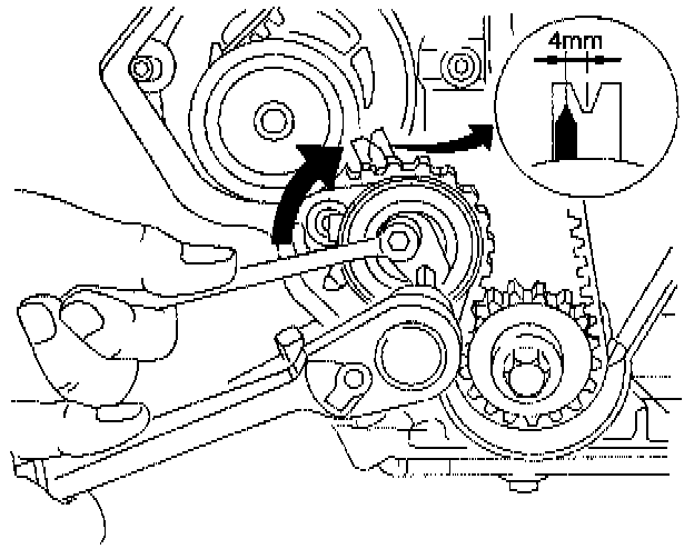 3. Set the timing belt shown in the illustration, ensure that tension side of the timing belt is taut and move the timing belt tension adjustment lever clockwise, until the pointer of the tensioner is flowing.