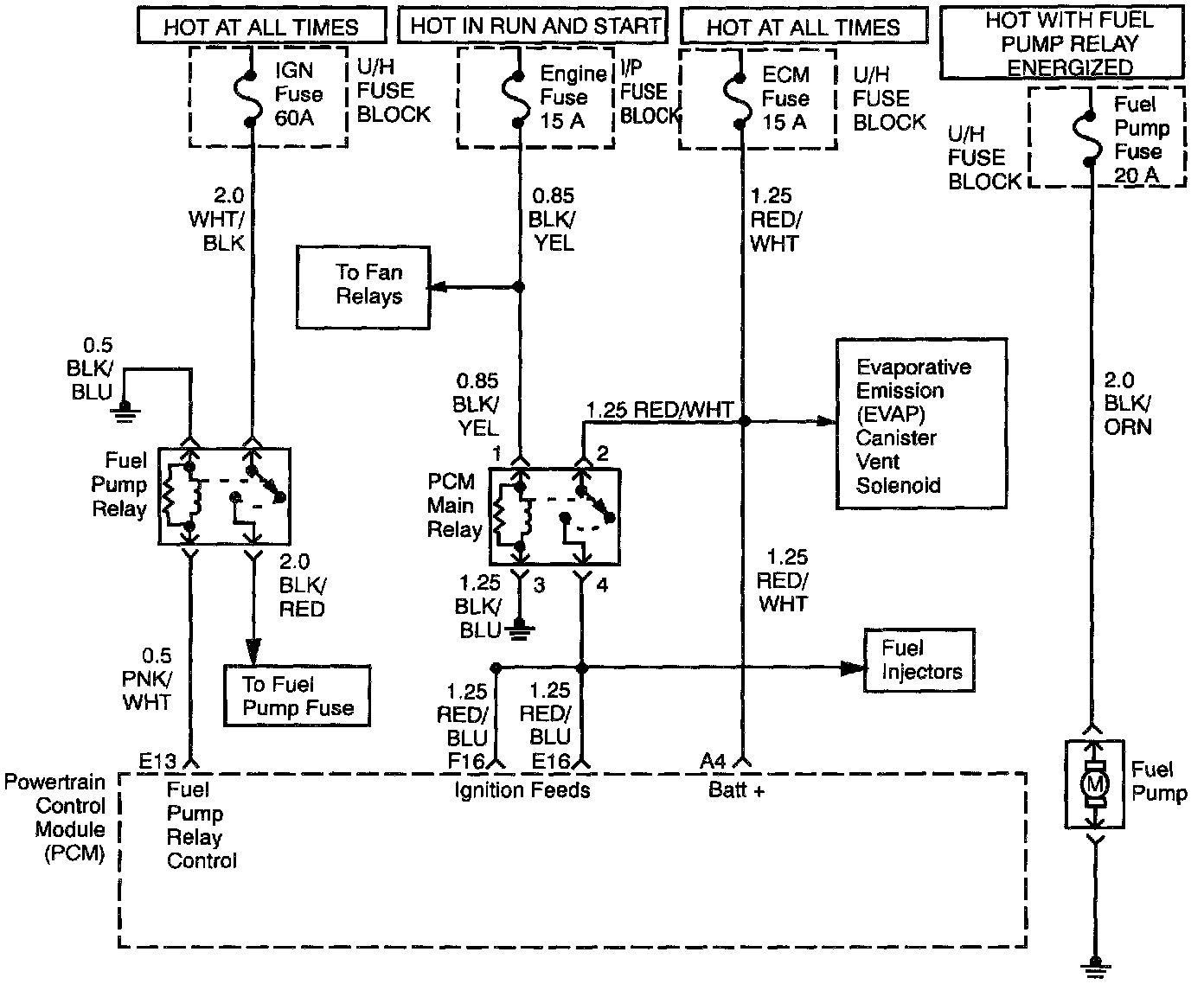 When the ignition switch is first turned ON, the power- train control module (PCM) energizes the fuel pump relay which applies power to the in-tank fuel pump. The fuel pump relay will remain ON as long as the engine is running or cranking and the PCM is receiving 58X crankshaft position pulses. If no 58X crankshaft position pulses are present, the PCM de-energizes the fuel pump relay within 2 seconds after the ignition is turned ON or the engine is stopped.