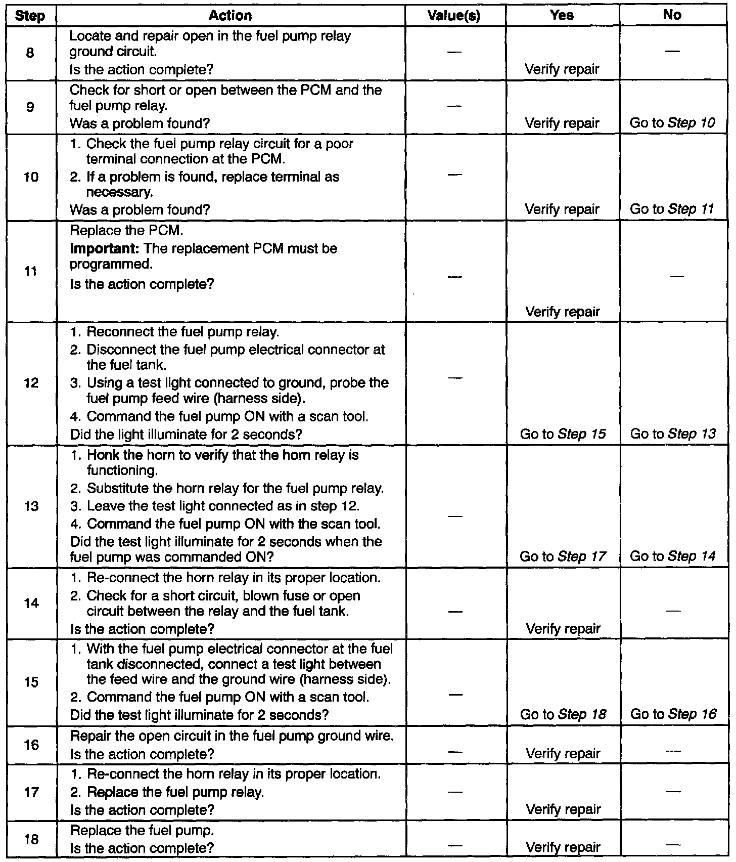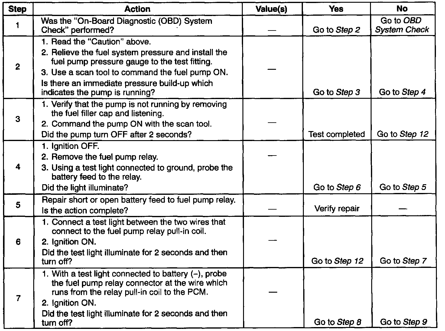 2. If the fuel pump is operating but incorrect pressure is noted, the fuel pump wiring is OK and the Fuel System Pressure Test" chart should be used for diagnosis.