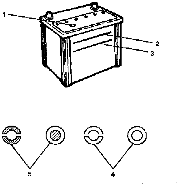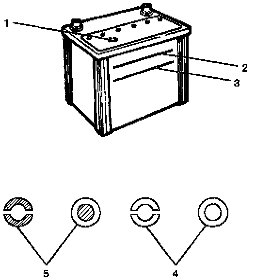 The fluid level should be between the upper level line(2) and lower level line(3) on side of battery.