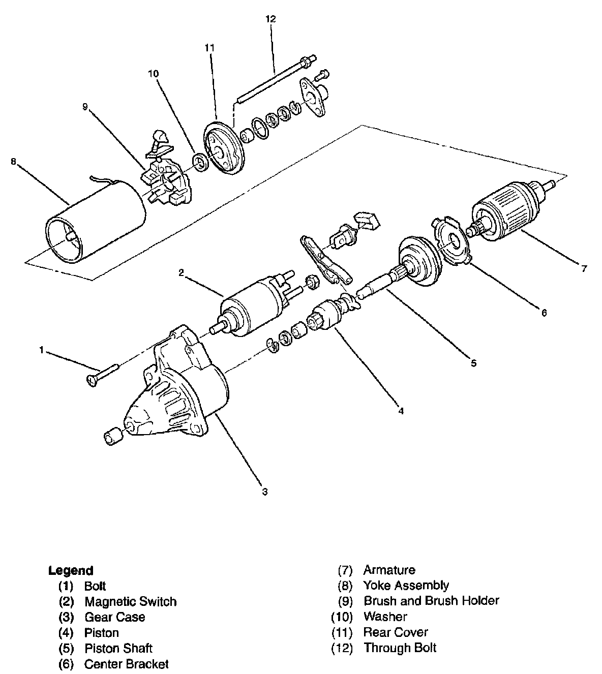 3. Remove bolts from starter (1), (2).