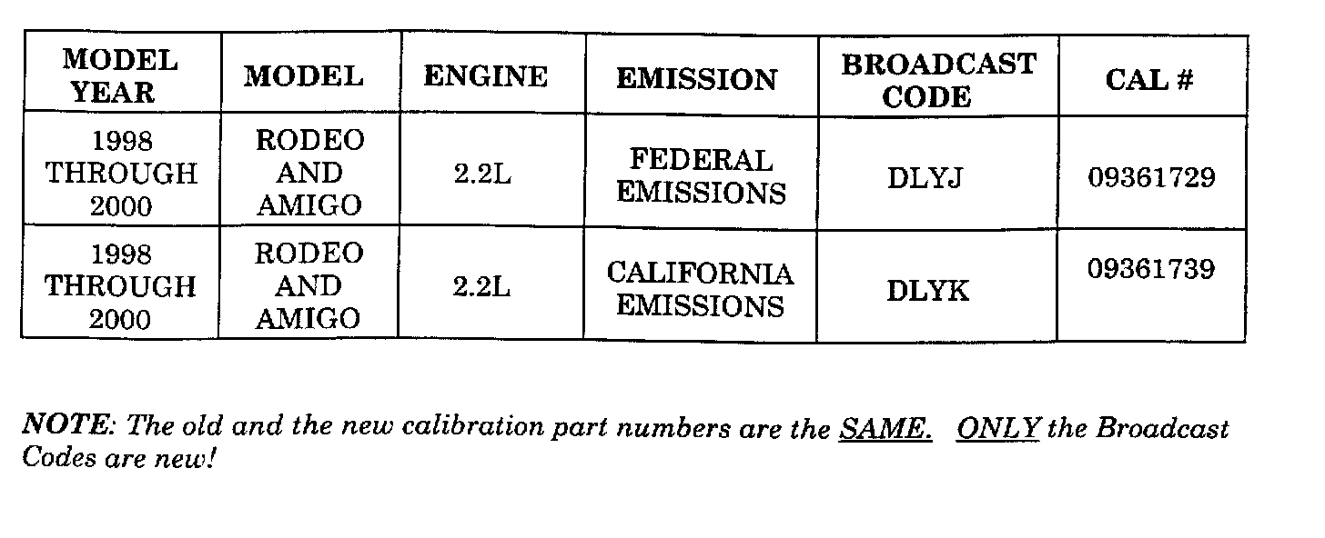 Some 1998 2.2L Amigos and Rodeos may show additional symptoms after Re-Programming with the updated Broadcast Code. These symptoms include the "LOW FUEL" light staying on and an inaccurate fuel gauge reading. These vehicles will also require the replacement of the fuel sender assembly.