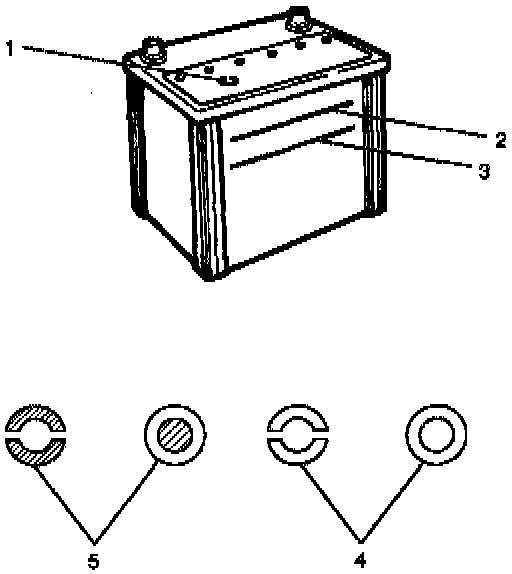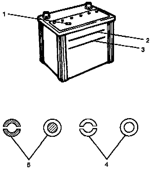 The fluid level should be between the upper level line (2) and lower level line (3) on side of battery.