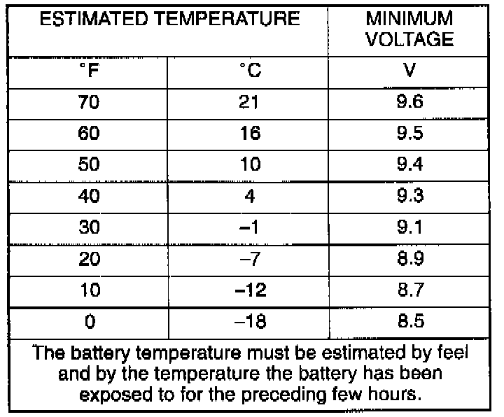 a. VOLTAGE DOES NOT DROP BELOW THE MINIMUM LISTED IN THE TABLE - The battery is good and should be returned to service.