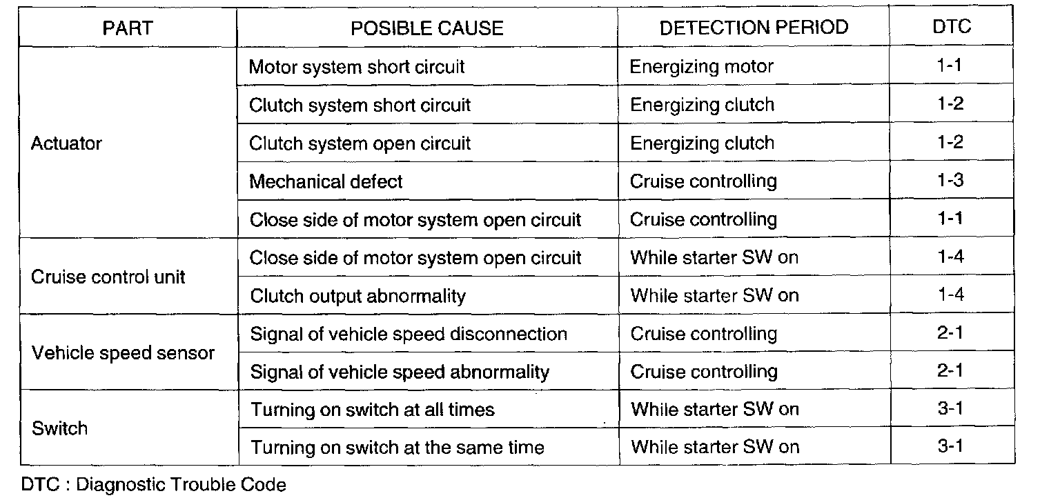 The cruise control unit uses the cruise main indicator light and diagnosis the failure, when the control unit detects abnormality on the table.