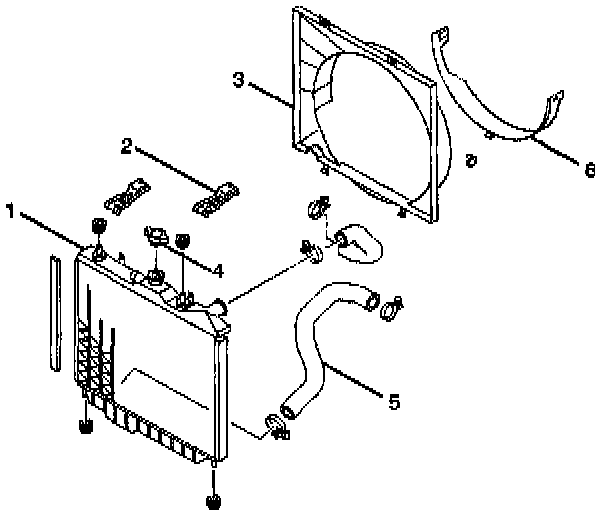 2. Install radiator assembly with hose, taking care not to damage the radiator core with a fan blade.