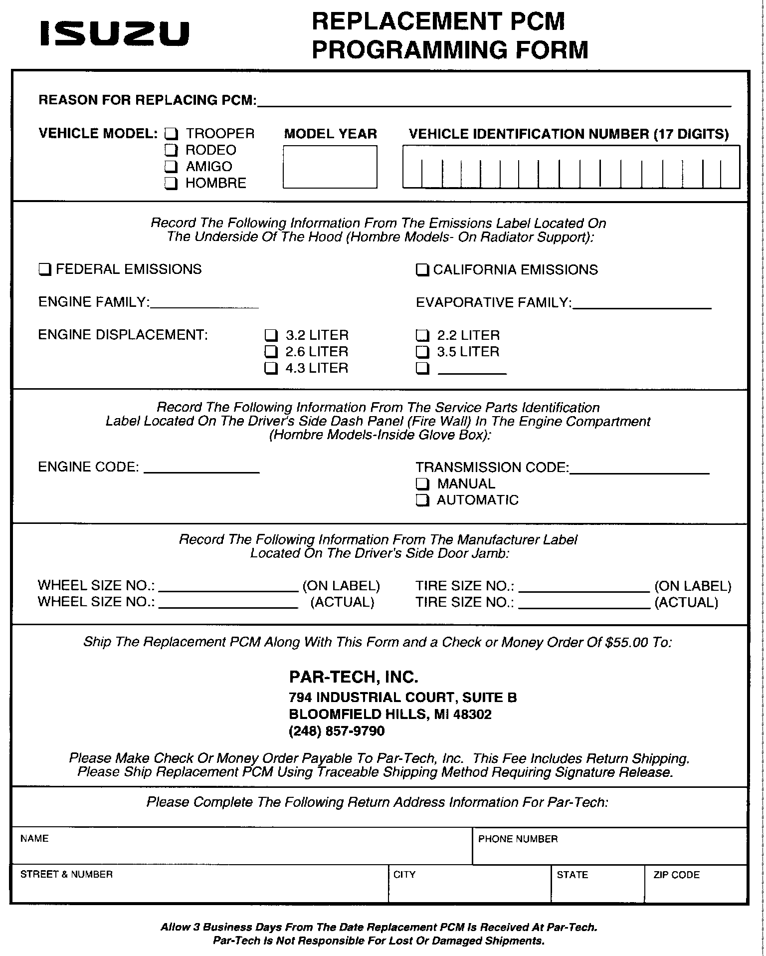 Included in this Service Bulletin is a Replacement PCM Programming Form. This form begins the replacement PCM programming process. When a customer makes an over-the-counter purchase of a replacement PCM, you must provide that customer a photocopy of this form. The form instructs the customer to fill in specific vehicle information, along with a return address; then, to ship the replacement PCM and completed form, together with a check or money order of $55.00 payable to Par-Tech, Inc., to the Par-Tech address printed on the form. Upon receipt at Par-Tech, the replacement PCM will be calibrated using the most current manufacturer specification, and then priority shipped to the return address entered on the form.