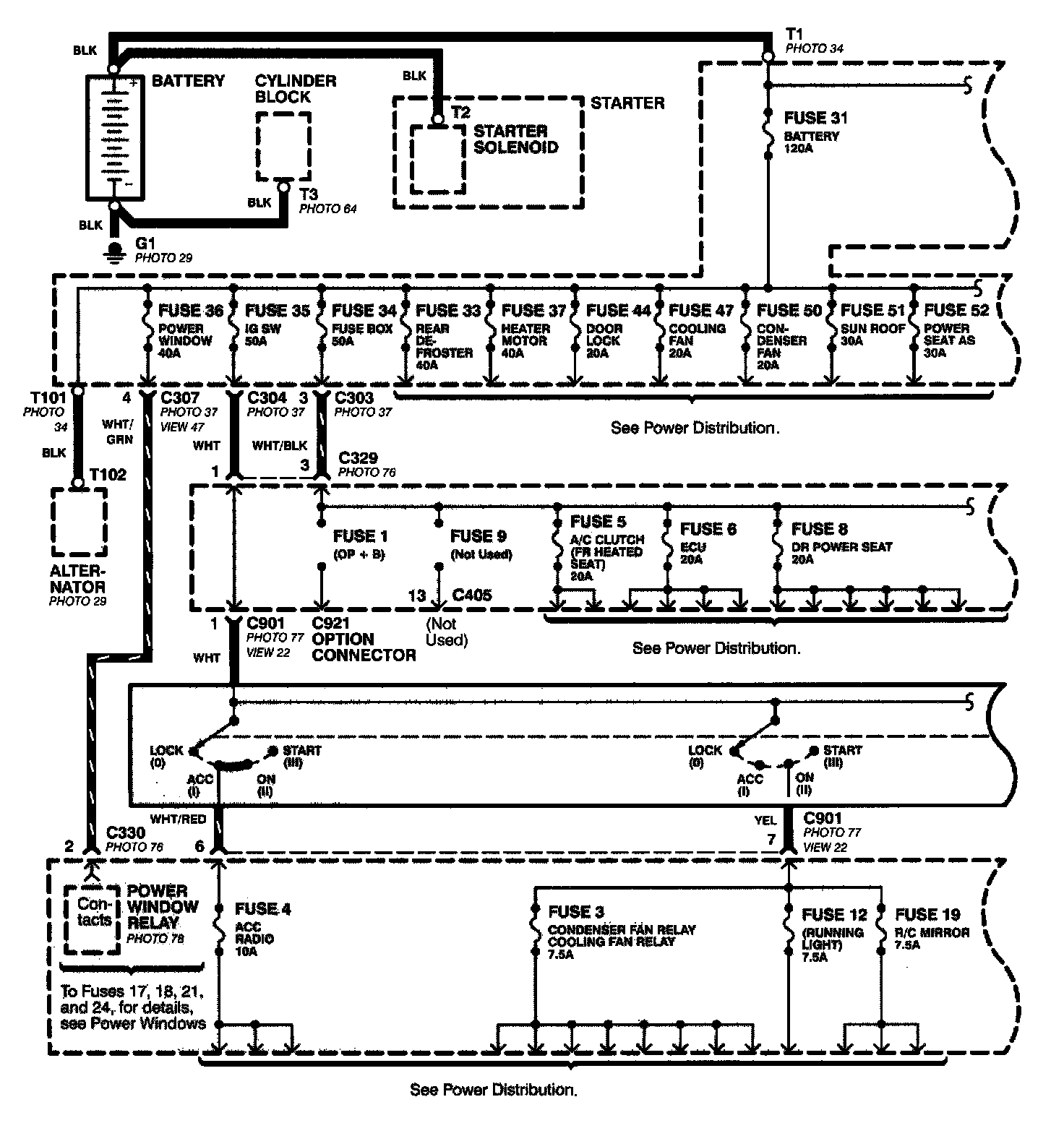 Power Distribution schematics show how power is supplied from the positive battery terminal to various circuits in the car. Refer to Power Distribution to get a more detailed picture of how power is supplied to the circuit you're working on.From Battery to Ignition Switch, Fuses and Relays