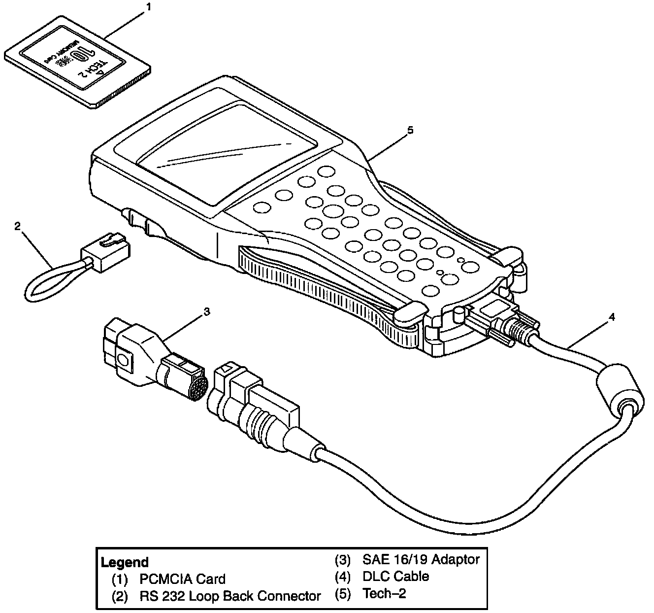 1. The ISUZU 98 System PCMCIA card (1) inserts into the Tech 2 (5).