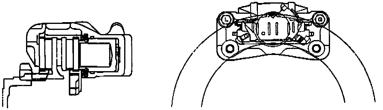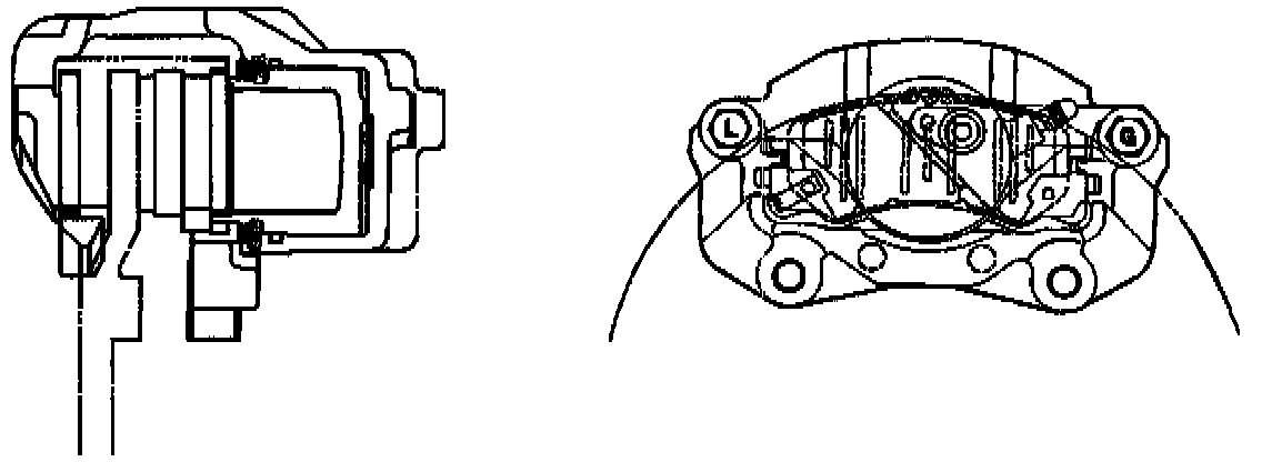 DESCRIPTIONThe disc brake assembly consists of a caliper, piston, rotor, pad assembly and support bracket. The caliper assembly has a single bore and is mounted to the support bracket with two mounting bolts. The support bracket allows the caliper to move laterally against the rotor. The caliper is a one-piece casting with the inboard side containing the piston bore. A square cut rubber seal is located in a groove in the piston bore which provides the hydraulic seal between the piston and the cylinder wall.