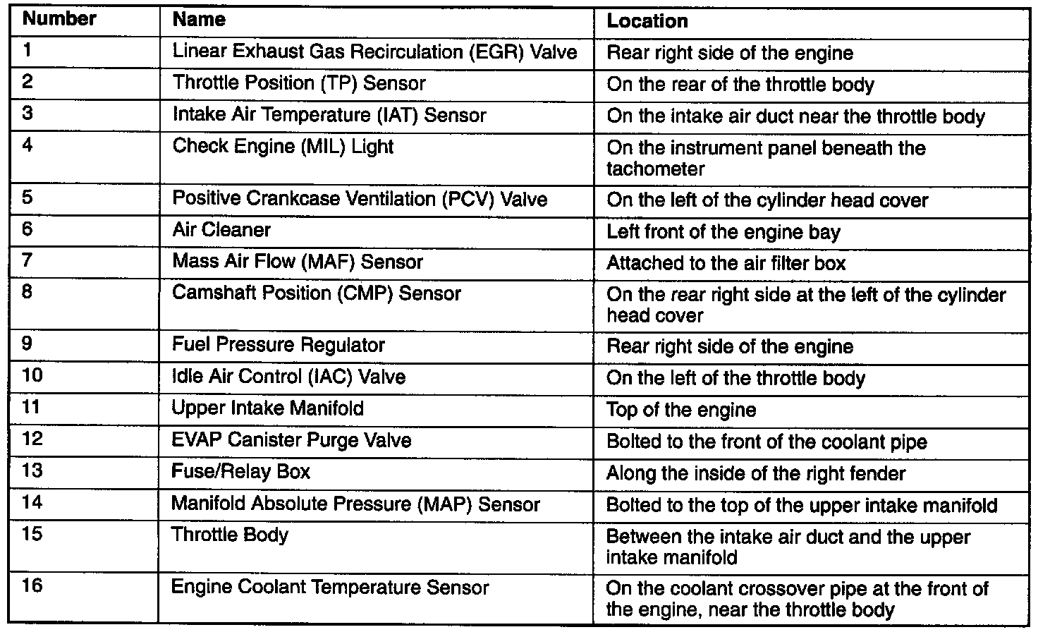 Engine Component Locator Table