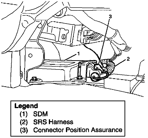 The SDM is connected to the SRS wiring harness by a 24-pin connector. This harness connector uses a shorting clip across certain terminals in the contact area. This shorting clip connects the "AIR BAG" warning lamp to ground when the SDM harness connector is disconnected or CPA (Connector Position Assurance) is not inserted even if completely connected. This will cause the "AIR BAG" warning lamp to come "ON" steady whenever the ignition switch is at the ON or START positions with the SDM disconnected.