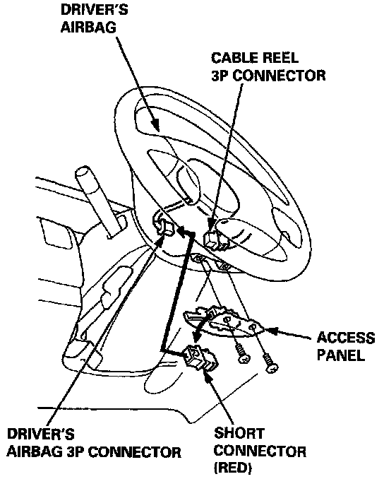 ^ Disconnect the 3P connector between the driver's airbag and cable reel, then connect the short connector (RED) to the airbag side of the connector.