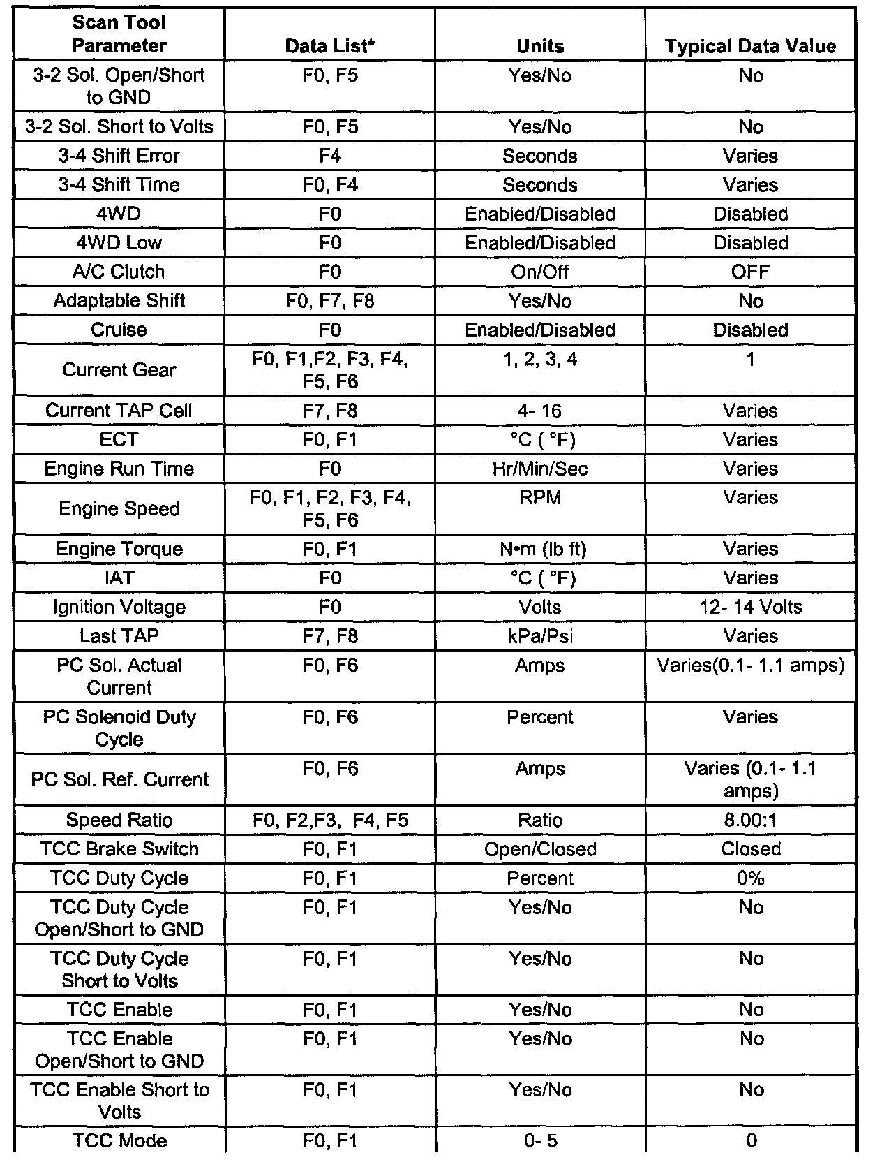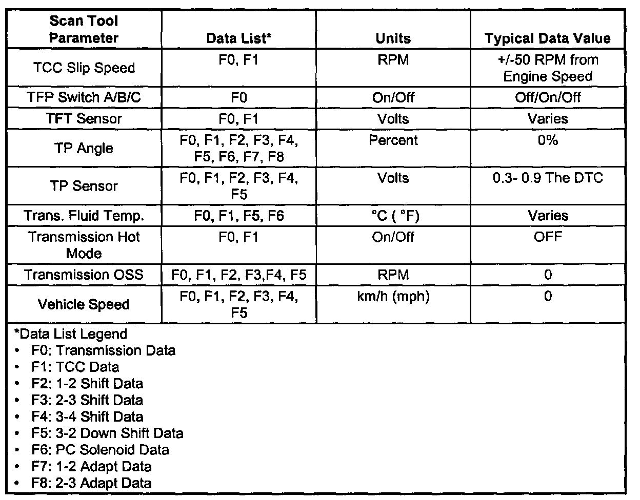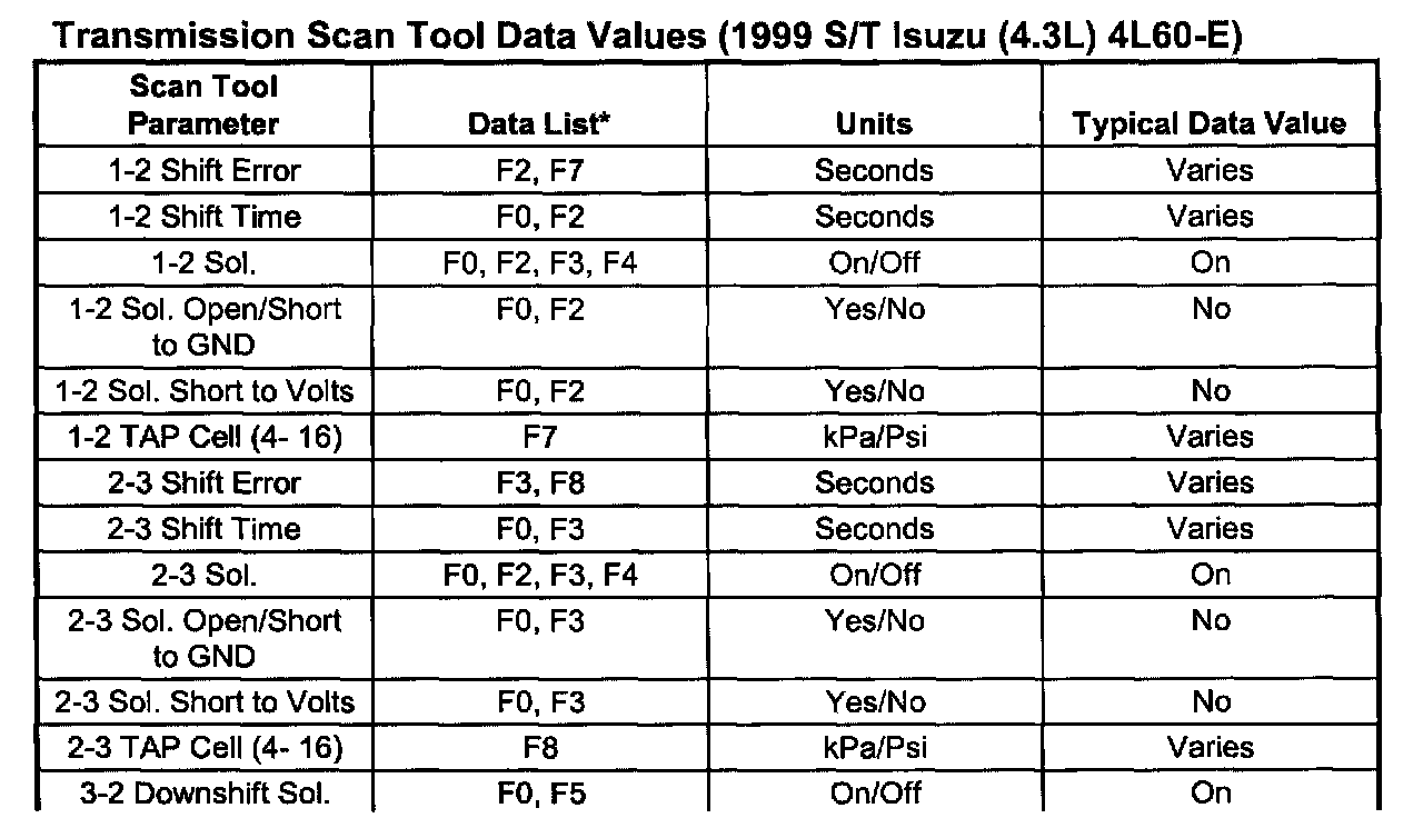 Transmission Scan Tool Data Values (1999 S/T Isuzu (2.2L) 4L60-E)