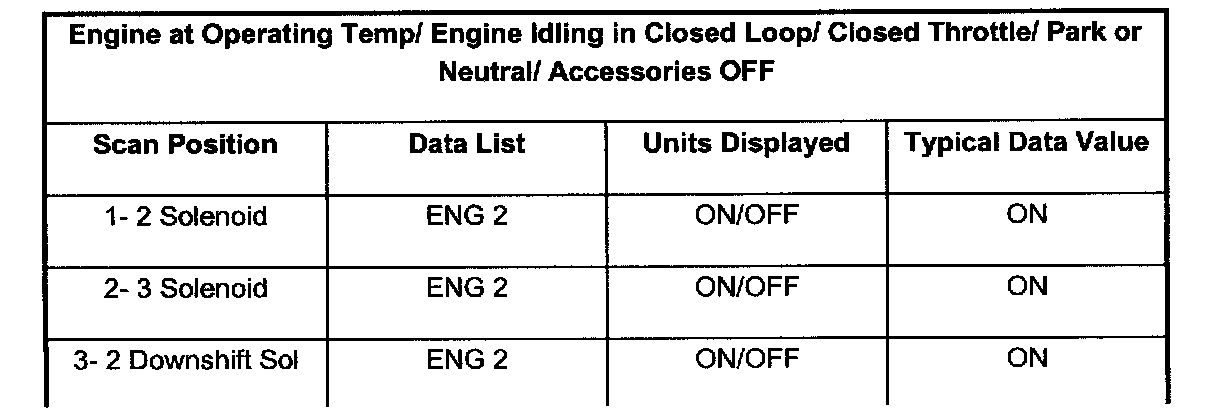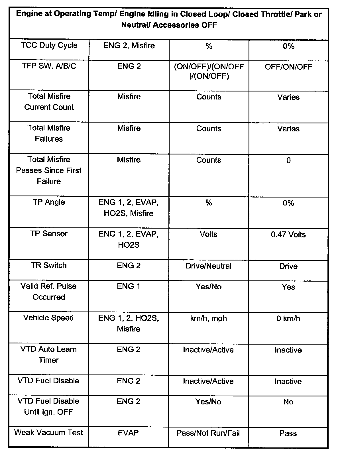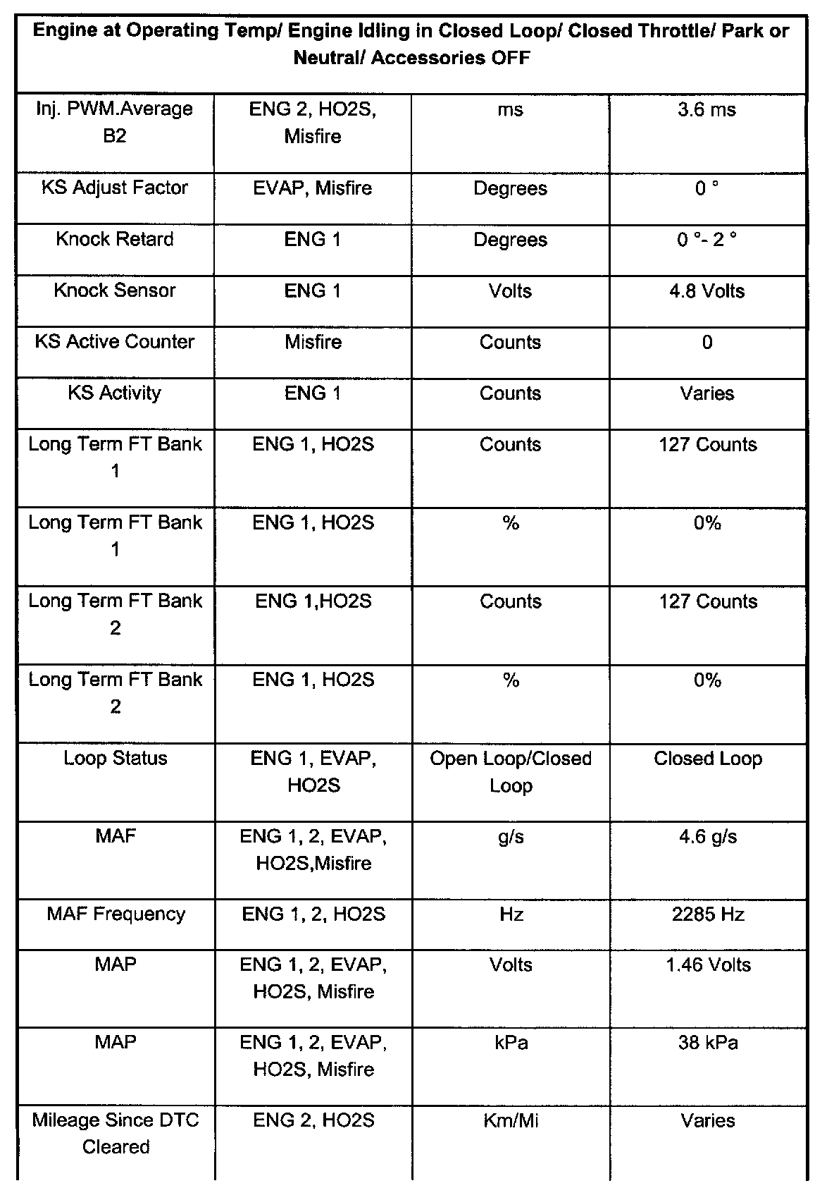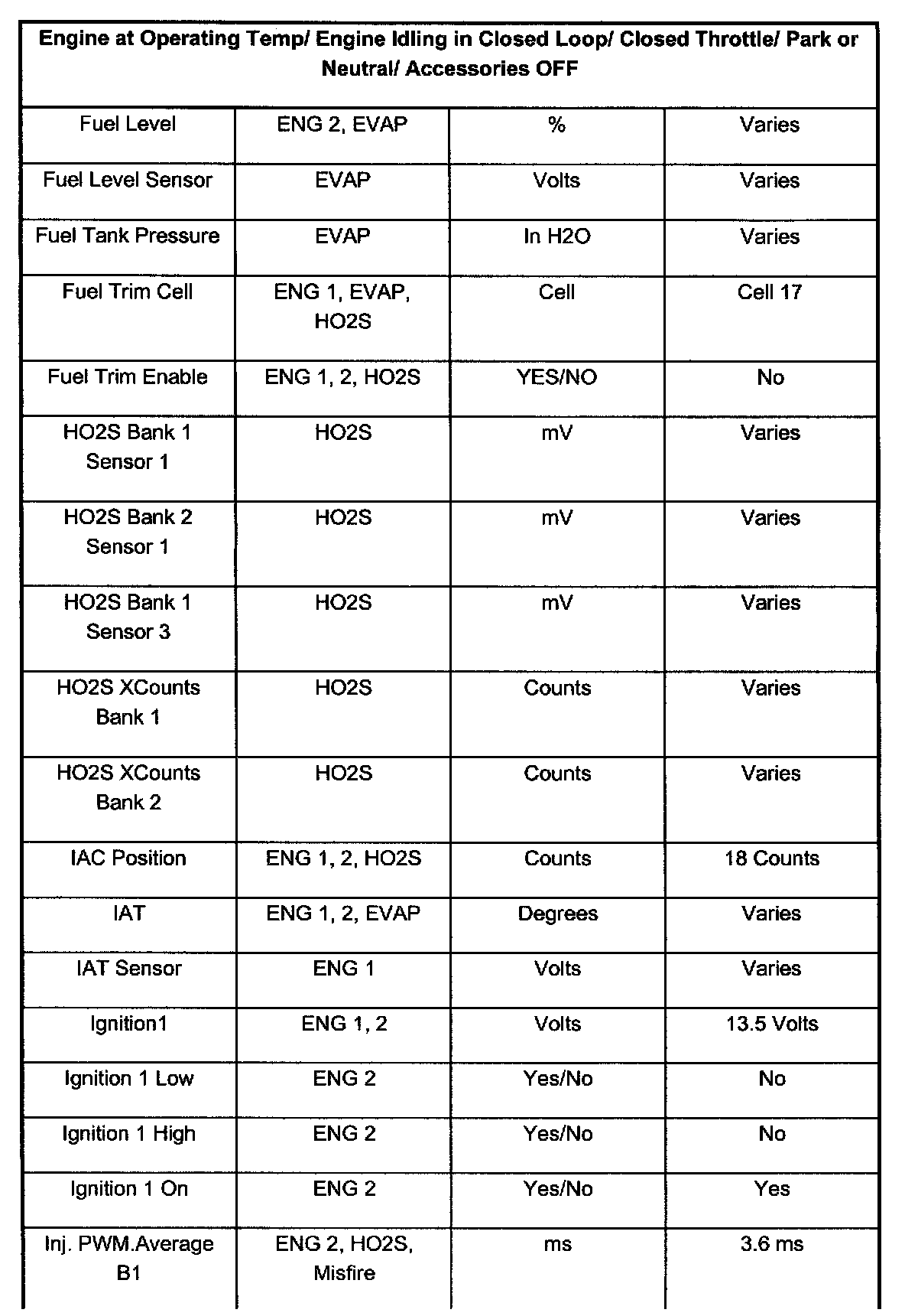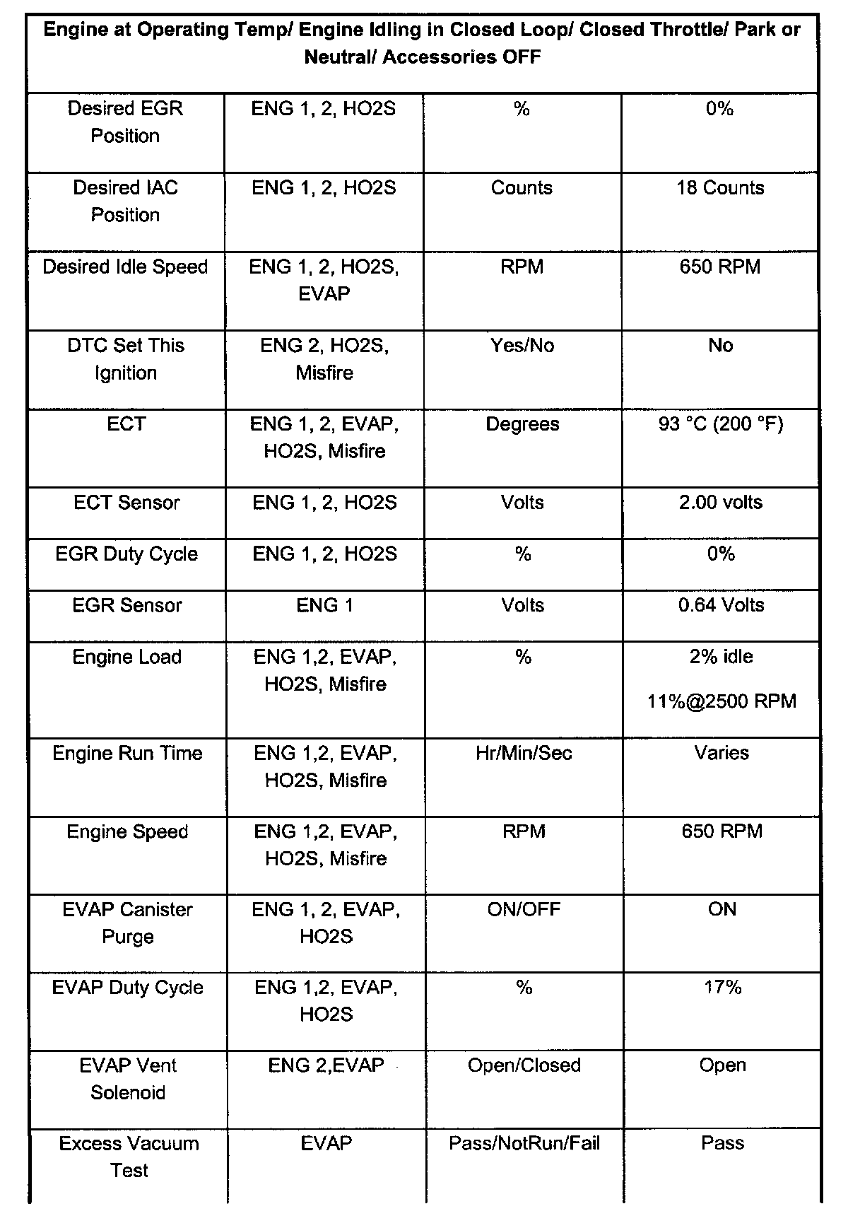 Engine Scan Tool Data ListUse the scan tool data listed in the table for comparison after the On-Board Diagnostic system check and finding the on-board diagnostics function properly with no diagnostic codes displayed. Not all parameters will apply to each vehicle. Use only the parameters which apply to your particular vehicle.