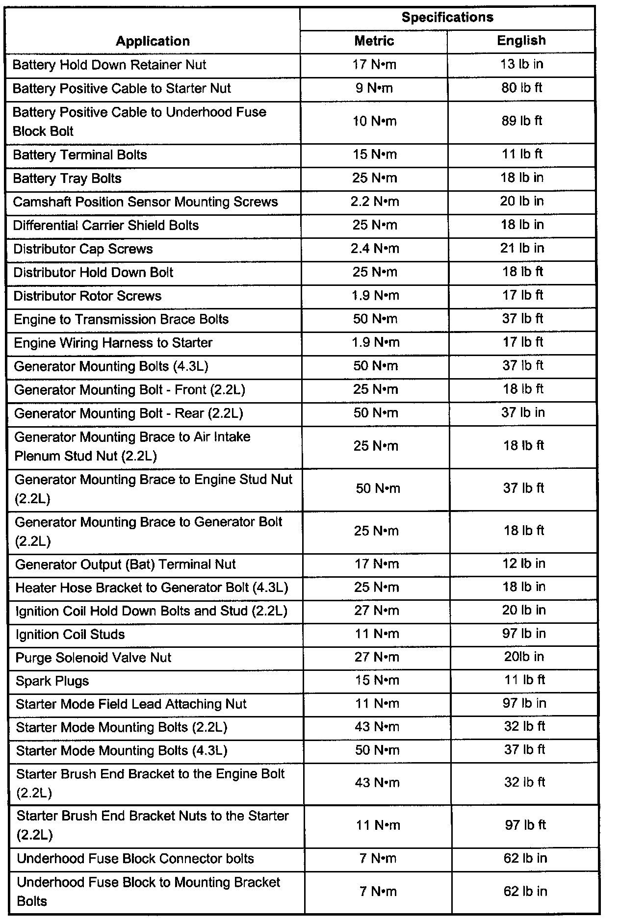 Fastener Tightening Specifications: