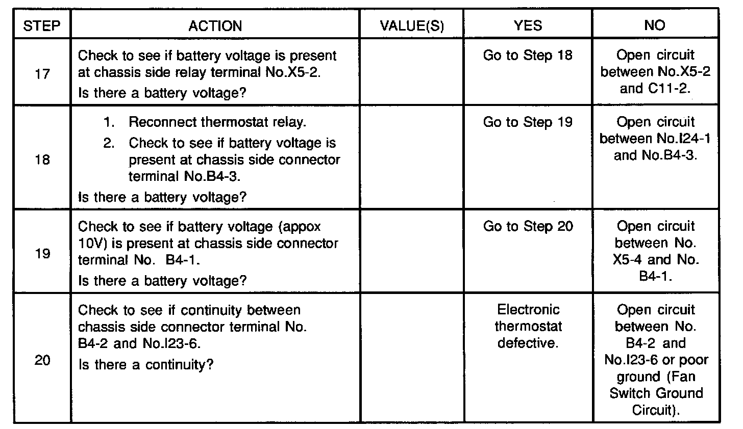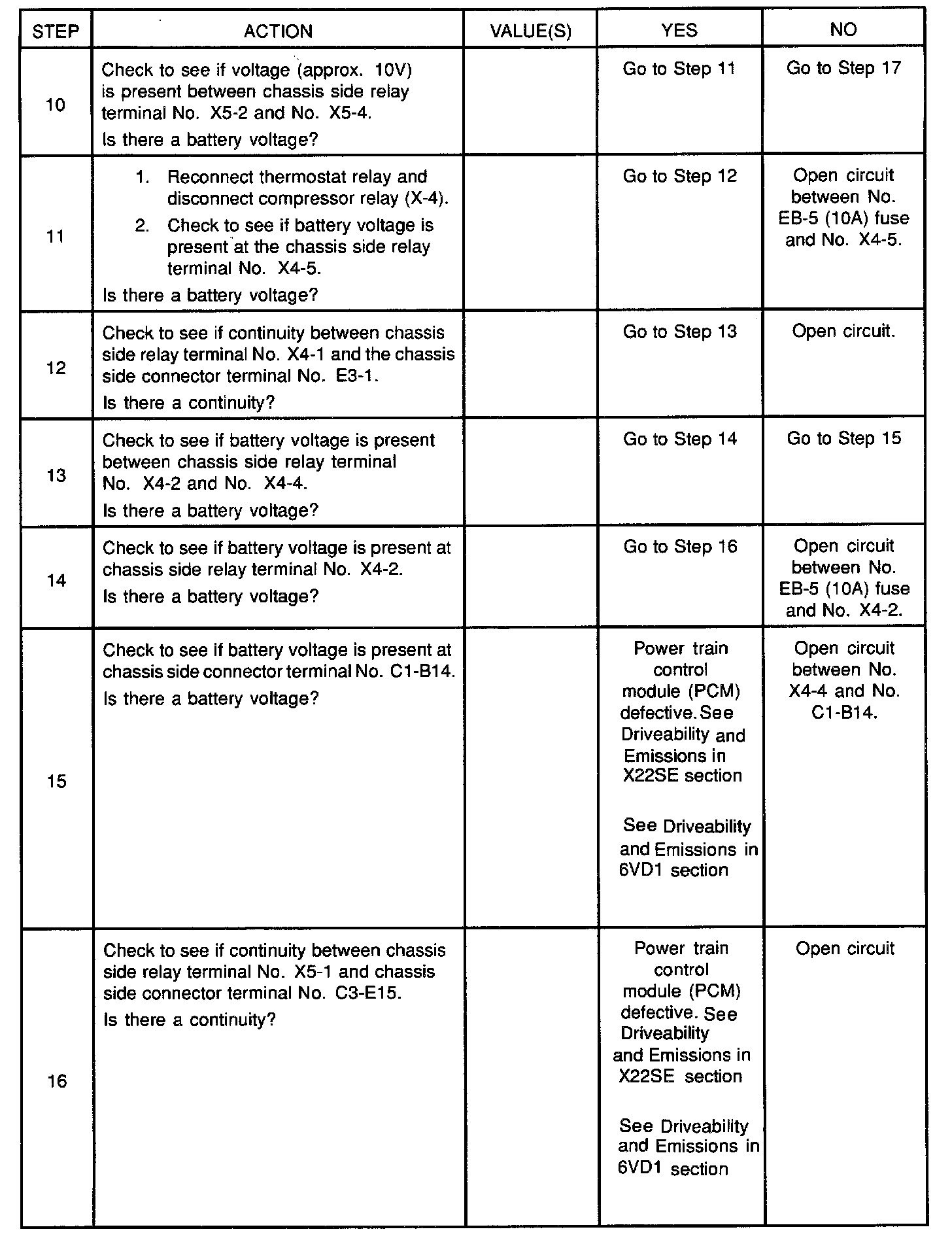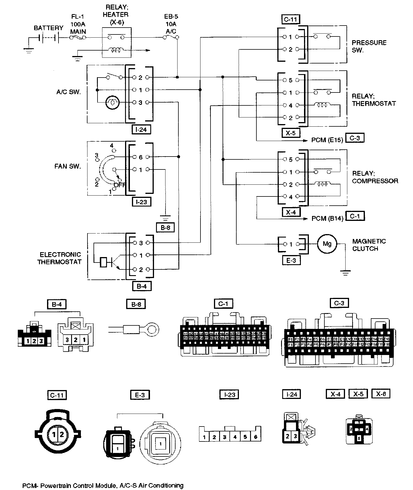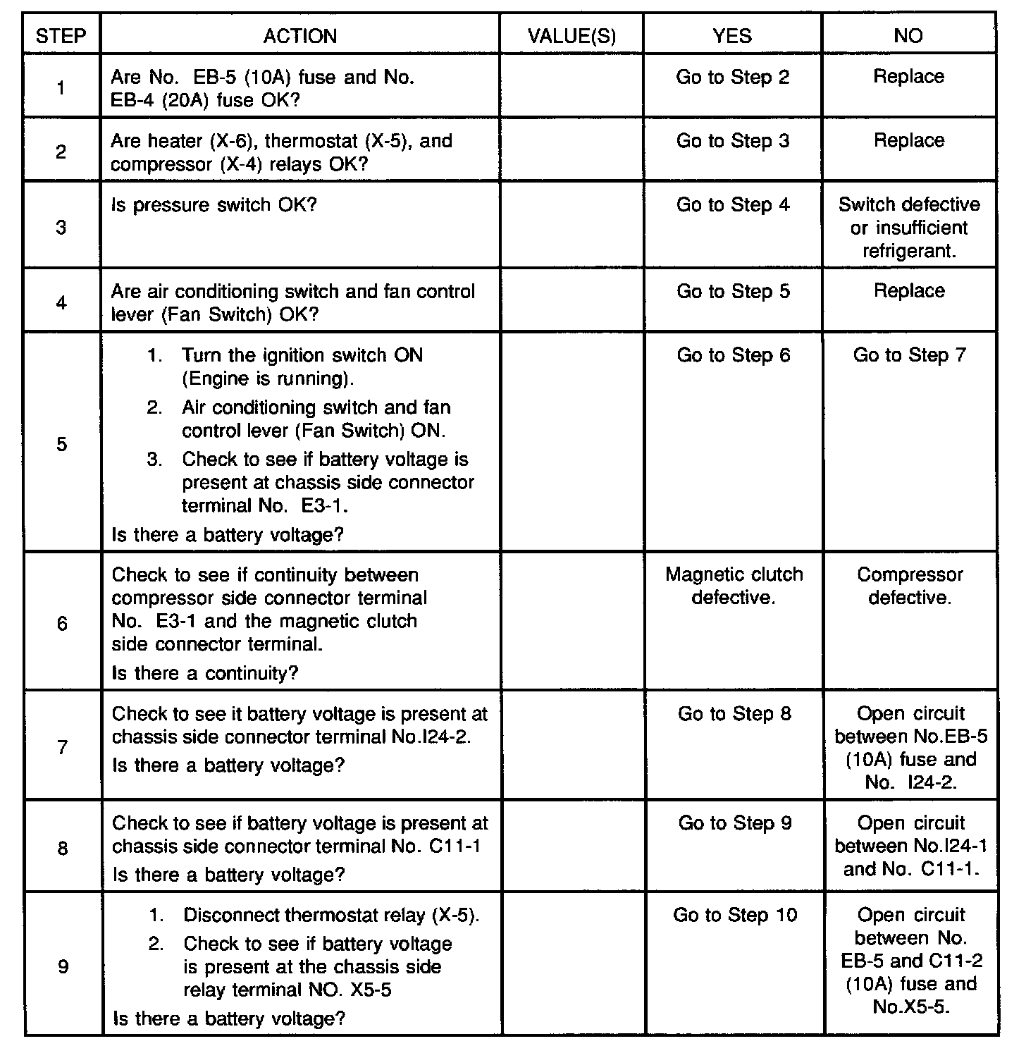 The air conditioning can be stopped by turning of the air conditioning switch or the fan control knob (fan switch). However, even when the air conditioning is in operation, the electronic thermostat, the pressure switch or the Powertrain Control Module / Engine Control Module is used to stop the air conditioning temporarily by turning off the magnetic clutch in the prearranged conditions to reduce the engine load which is being caused by the rise in the engine coolant temperature, and the acceleration of the vehicle, etc. For the inspection of the relays, switches and units in the table.
