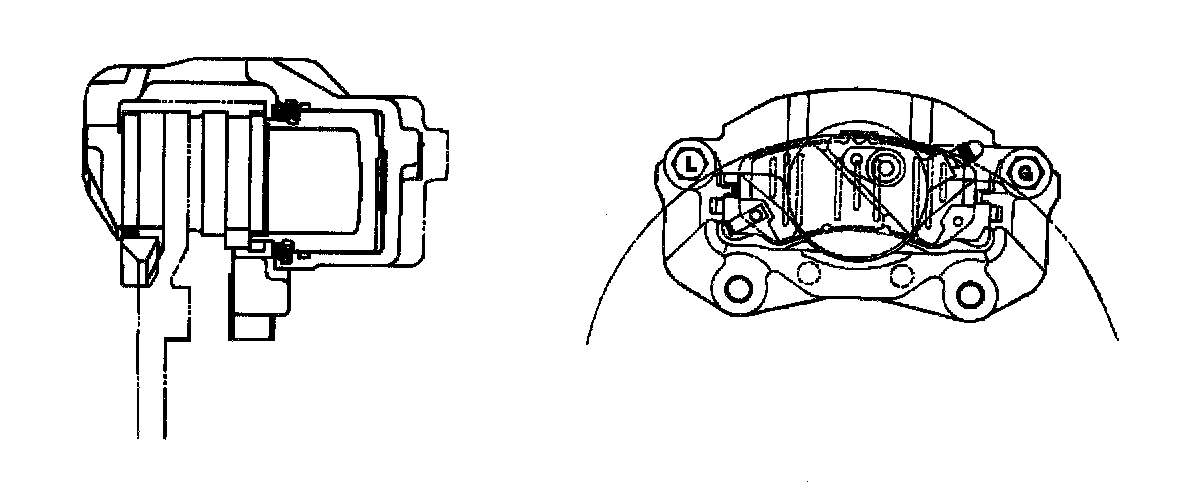 DESCRIPTIONThe disc brake assembly consists of a caliper, piston, rotor, pad assembly and support bracket. The caliper assembly has a single bore and is mounted to the support bracket with two mounting bolts. The support bracket allows the caliper to move laterally against the rotor. The caliper is a one-piece casting with the inboard side containing the piston bore. A square cut rubber seal is located in a groove in the piston bore which provides the hydraulic seal between the piston and the cylinder wall.