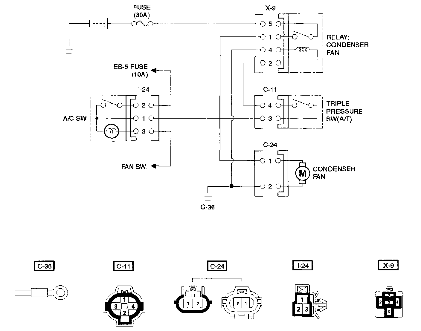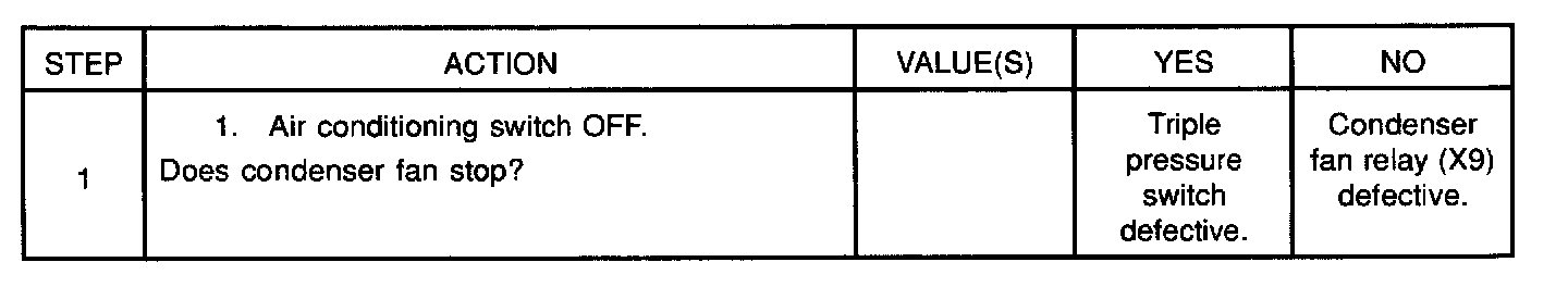 While the air conditioning is ON, the cycling switch in the triple pressure switch senses the refrigerant pressure, and activates the condenser fan to improve the cooling capacity of the condenser when the refrigerant pressure exceeds a set pressure value. The condenser fan stops when the air conditioning is turned OFF or when the pressure goes down below the set pressure value.