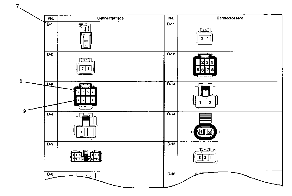The harness connector faces show each connector's number (7), configuration (8) and the pin number (9).