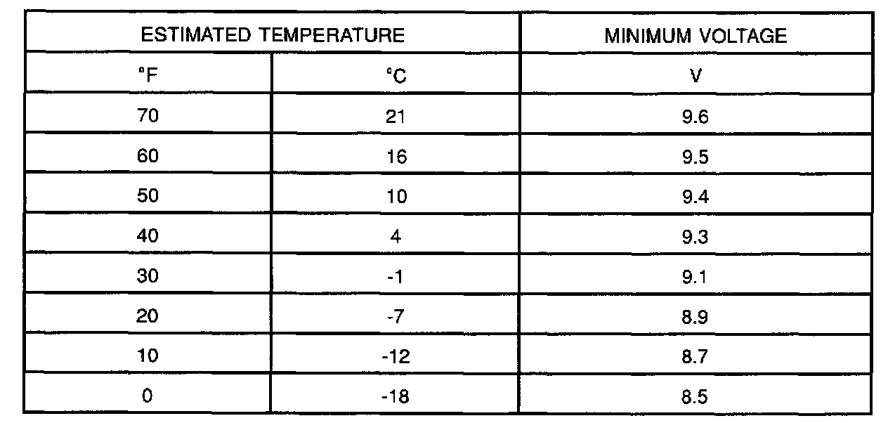 a. VOLTAGE DOES NOT DROP BELOW THE MINIMUM LISTED IN THE TABLE - The battery is good and should be returned to service.