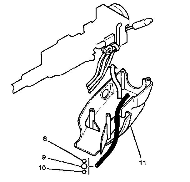 4. When installing the steering cowl (11), be sure to pass the harnesses through the route as shown in the figure So that the starter switch harness (8), the combination switch harness (9) and inflator module harness (10) will not get caught.