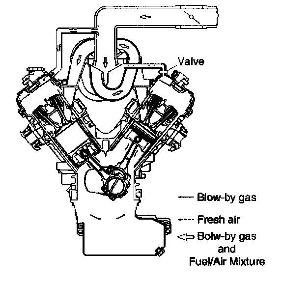 Crankcase Ventilation System Purpose/OperationThe crankcase ventilation system is use to consume crankcase vapors in the combustion process instead of venting them to the atmosphere. Fresh air from the throttle body is supplied to the crankcase and mixed with blow-by gases. This mixture is then passed through the positive crankcase ventilation (PCV) valve into the common chamber.