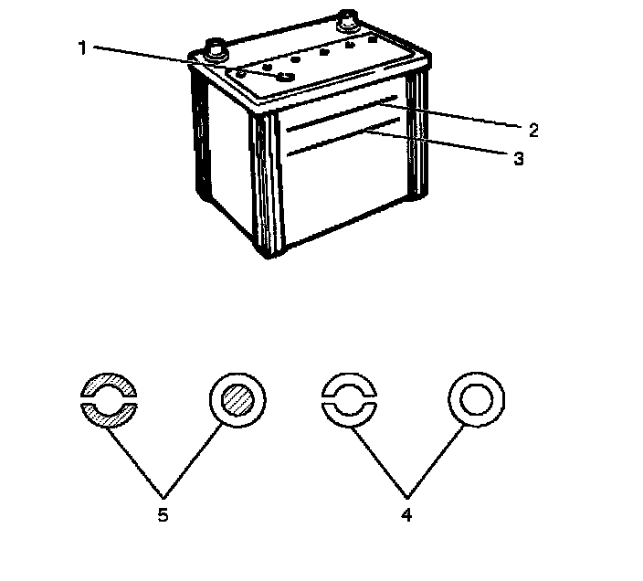 The fluid level should be between the upper level line(2) and lower level line(3) on side of battery.