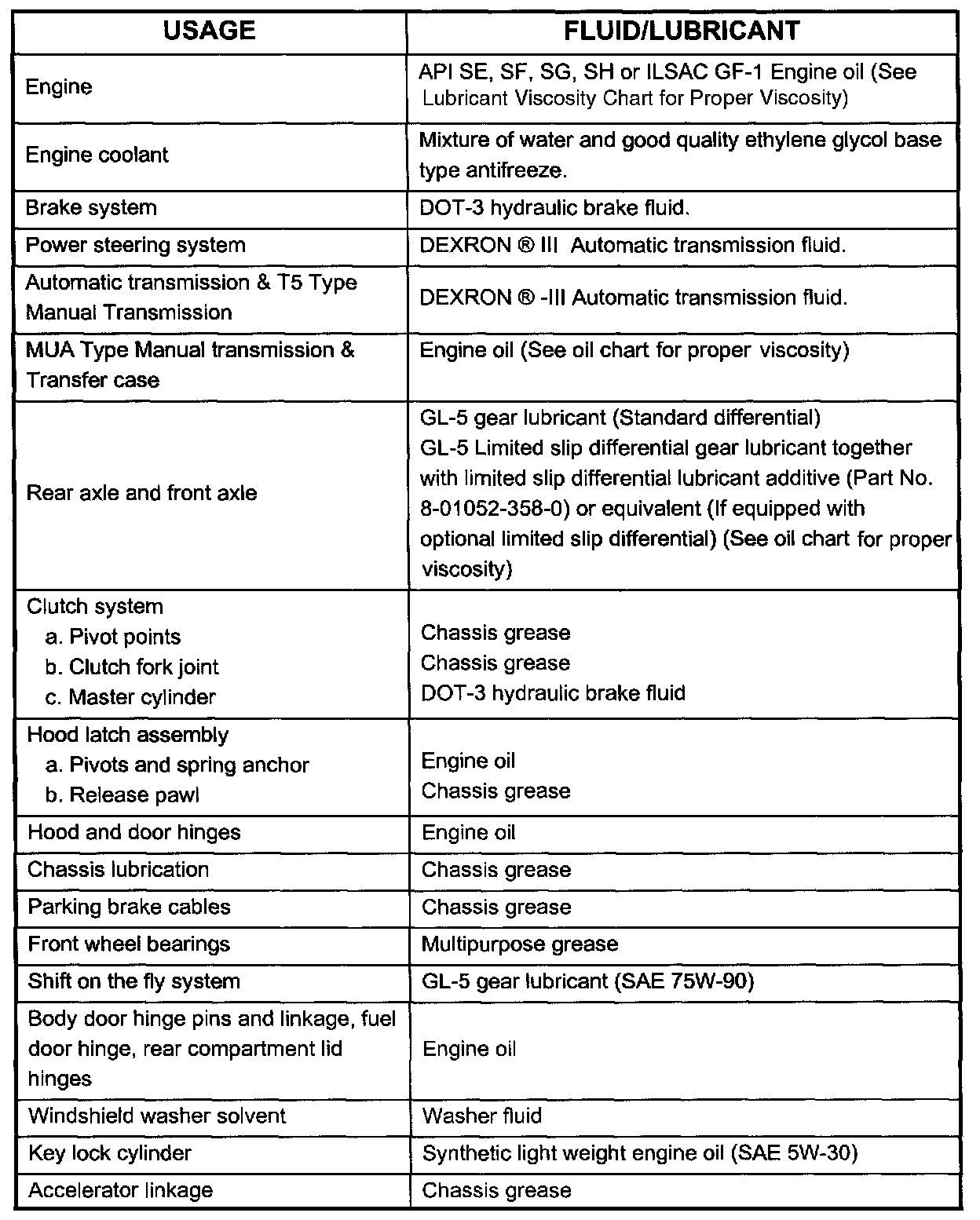 Recommended Fluids & Lubricants: