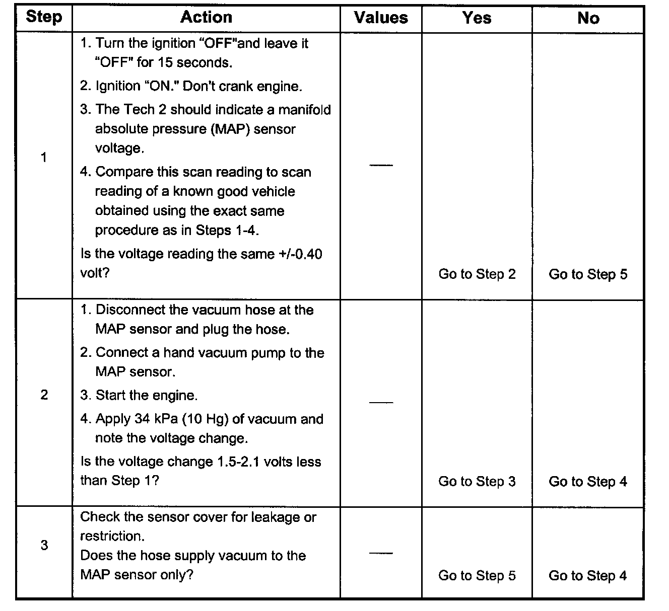 2. Applying 34 kPa (10 Hg) vacuum to the MAP sensor should cause the voltage to be 1.5 - 2.1 volts less than the voltage at step 1. Upon applying vacuum to the sensor, the change in voltage should be instantaneous. A slow voltage change indicates a faulty sensor.