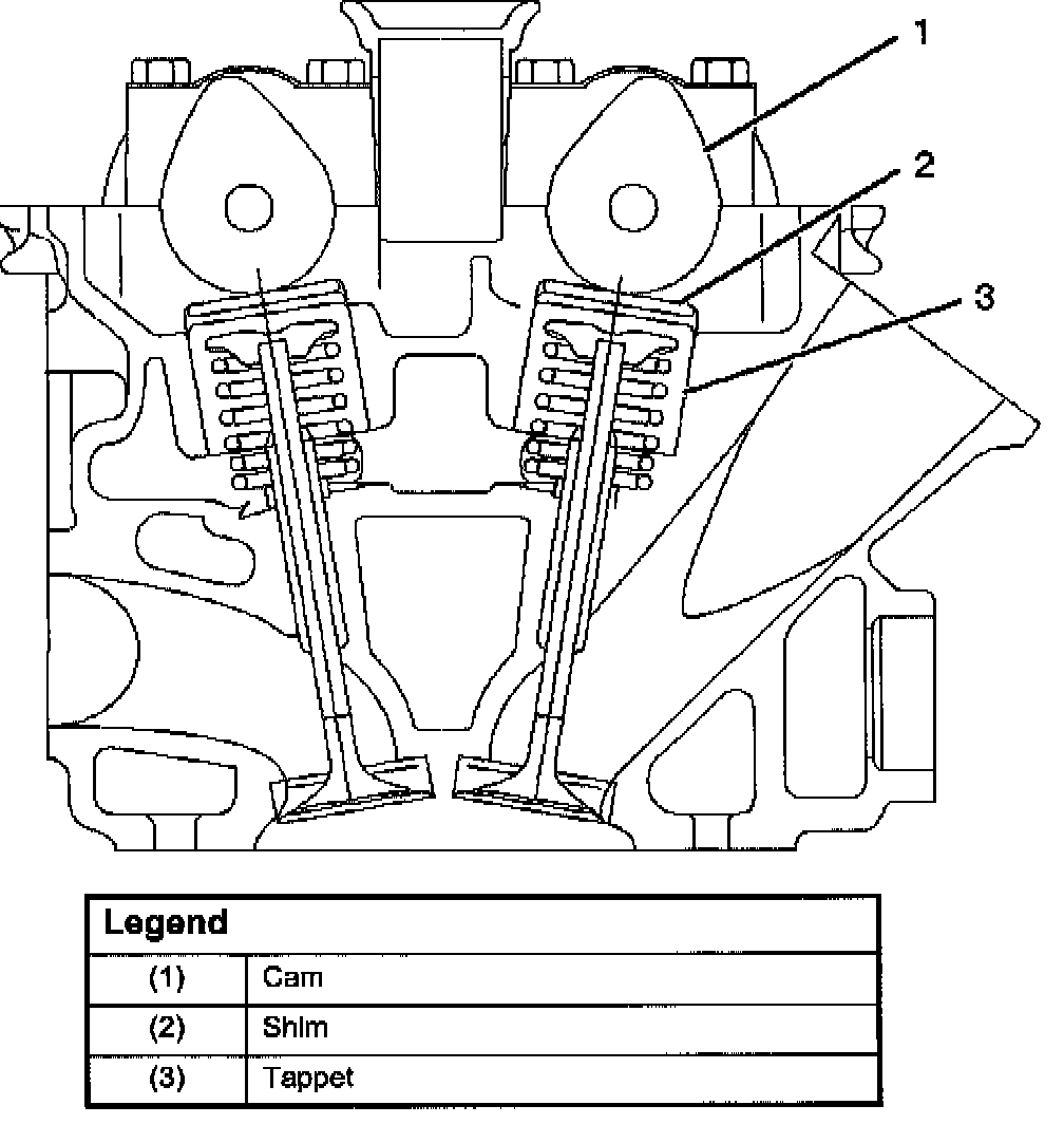 Valve Clearance AdjustmentsNote: To adjust valve clearance, apply engine oil to the cam as well as to the adjusting shim (2) with the cylinder head built on the cylinder block, give a few turns to the camshaft by means of timing pulley tightening bolt, and measure valve clearance when the nose of cam is just opposite to maximum cam lift (1) as shown in illustration.