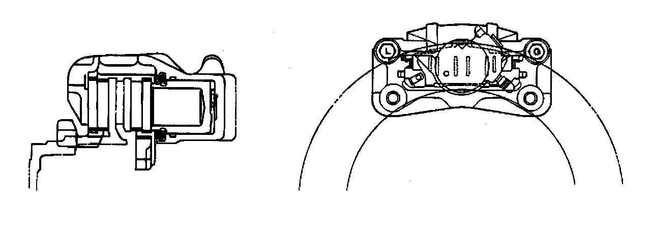 The disc brake assembly consists of a caliper, piston, rotor, pad assembly and support bracket. The caliper assembly has a single bore and is mounted to the support bracket with two mounting bolts. The support bracket allows the caliper to move laterally against the rotor. The caliper is a one-piece casting with the inboard side containing the piston bore. A square cut rubber seal is located in a groove in the piston bore which provides the hydraulic seal between the piston and the cylinder wall.