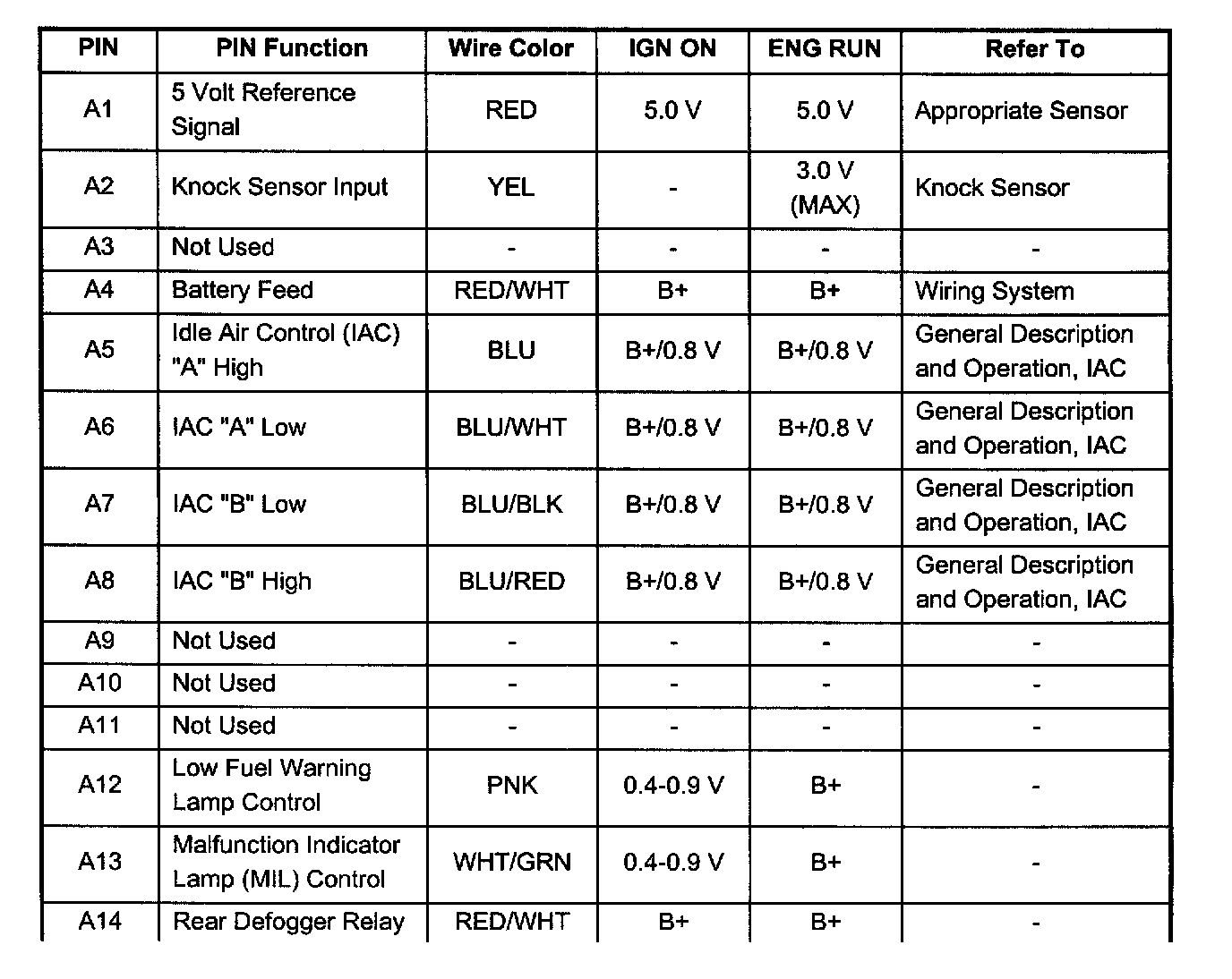 PCM Pinout Table, 32 Pin Red Connector - Row "A" ( Pin A1 - A14):