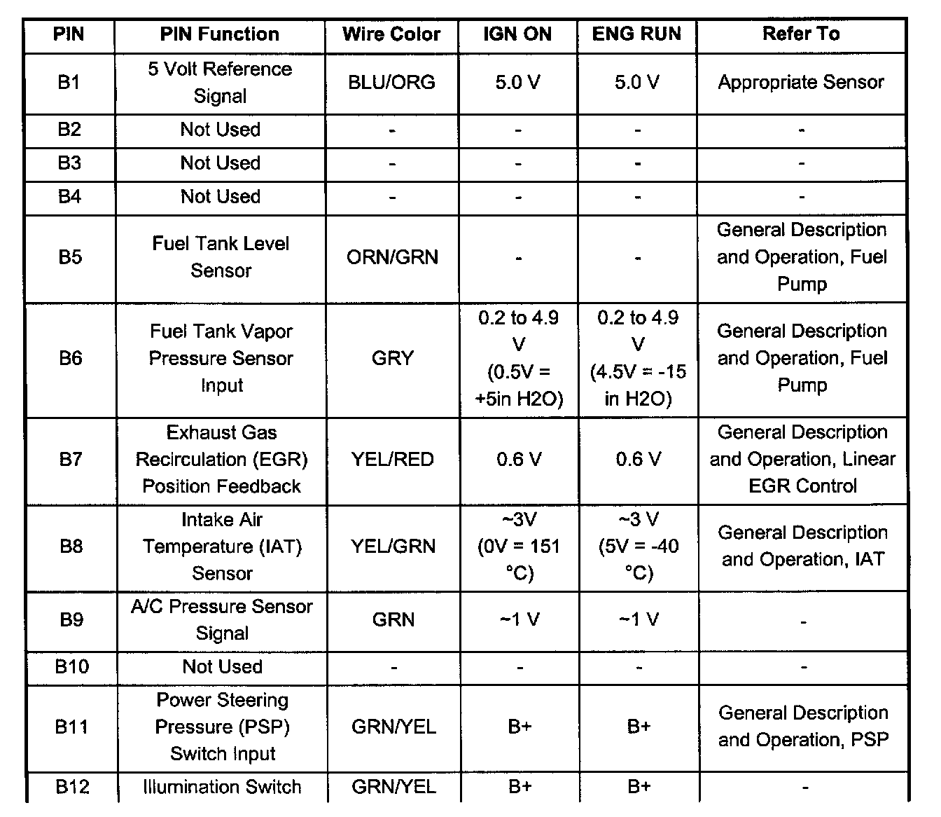 PCM Pinout Table, 32-Pin Red Connector - Row "B" ( Pin B1 - B12):