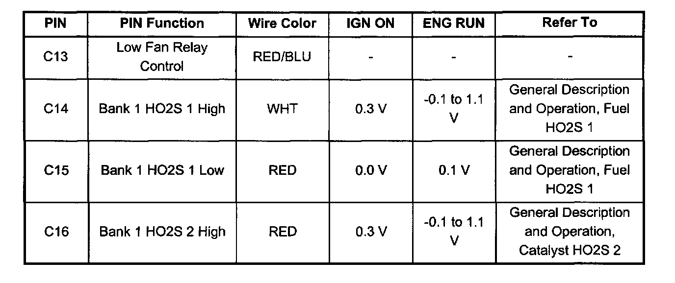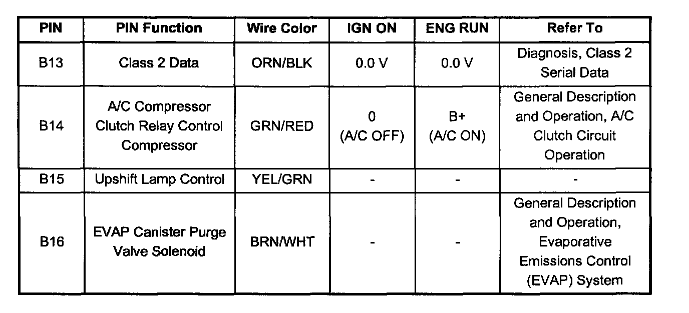 PCM Pinout Table, 32-Pin Red Connector - Row "B" ( Pin B13 - B16):