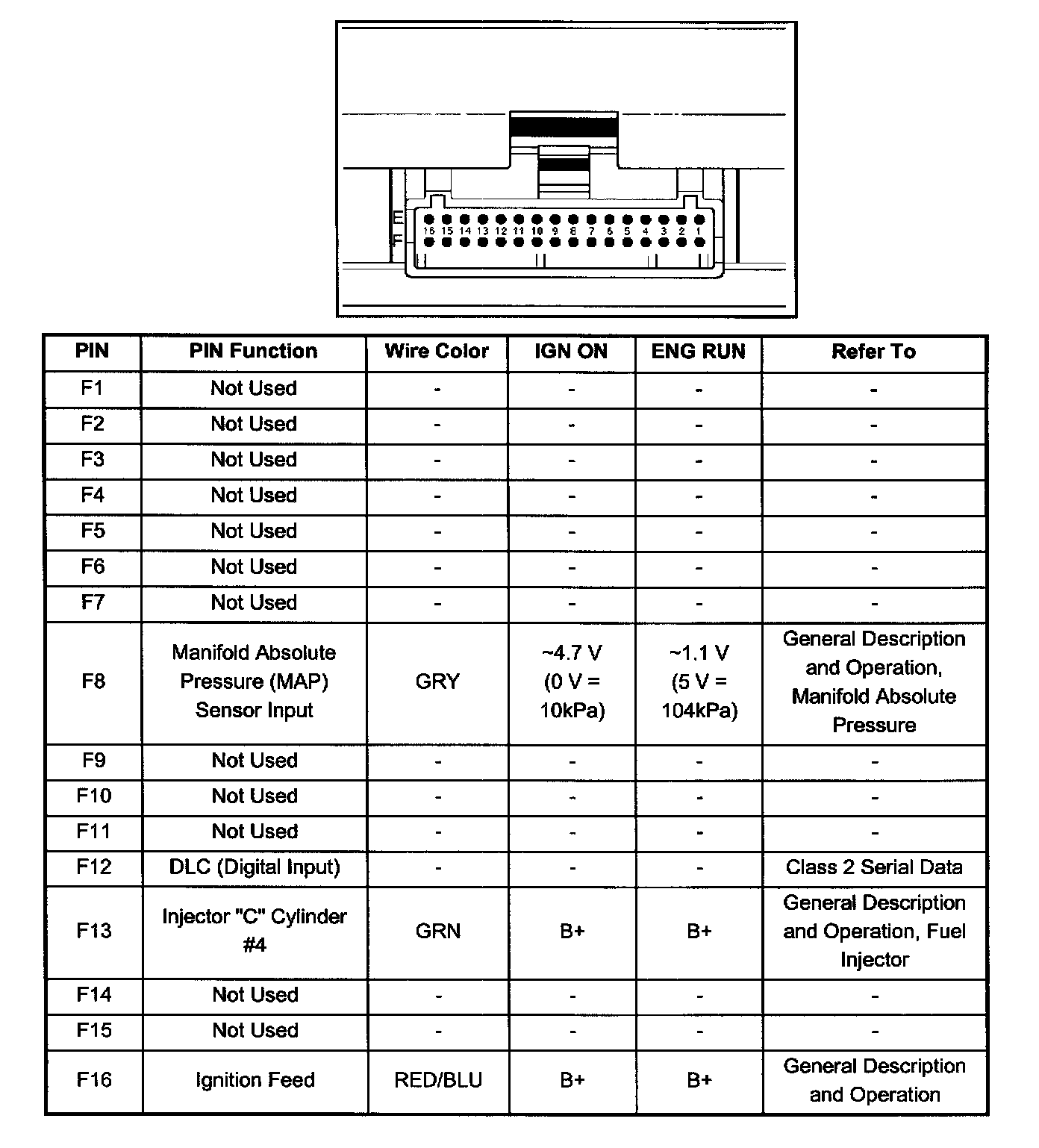 PCM Pinout Table, 32 - Pin White Connector - Row "F":