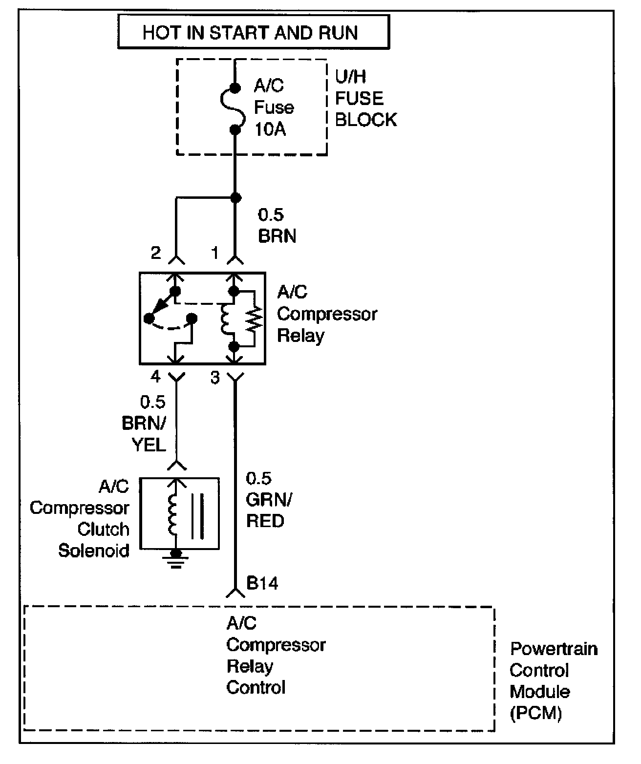 When air conditioning and blower fan are selected, and if the system has a sufficient refrigerant charge, a 12-volt signal is supplied to the A/C request input of the powertrain control module (PCM). The A/C request signal may be temporarily canceled during system operation by the electronic thermostat in the evaporator case. The electronic thermostat may intermittently remove the control circuit ground for the A/C thermostat relay to prevent the evaporator from forming ice. When the A/C request signal is received by the PCM, the PCM supplies a ground from the compressor clutch relay if the engine operating conditions are within acceptable ranges. With the A/C compressor relay energized, battery voltage is supplied to the compressor clutch coil.