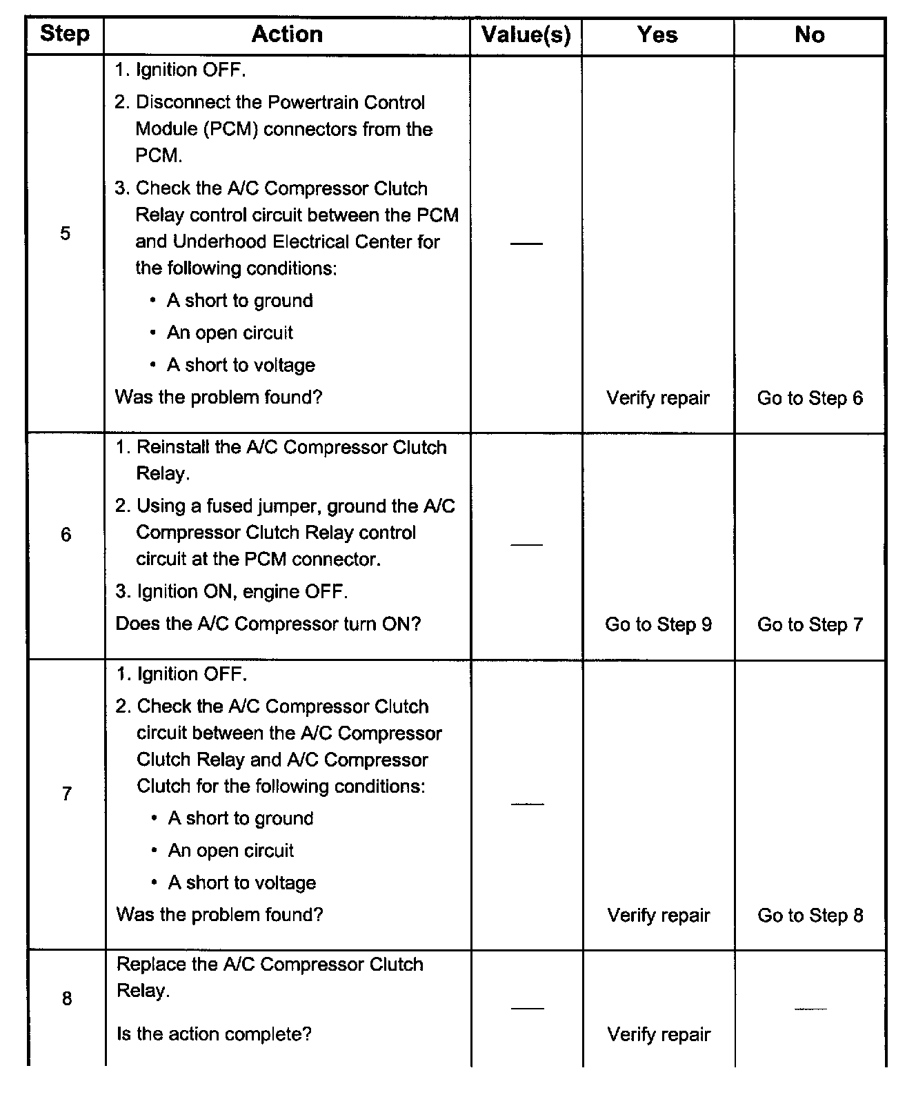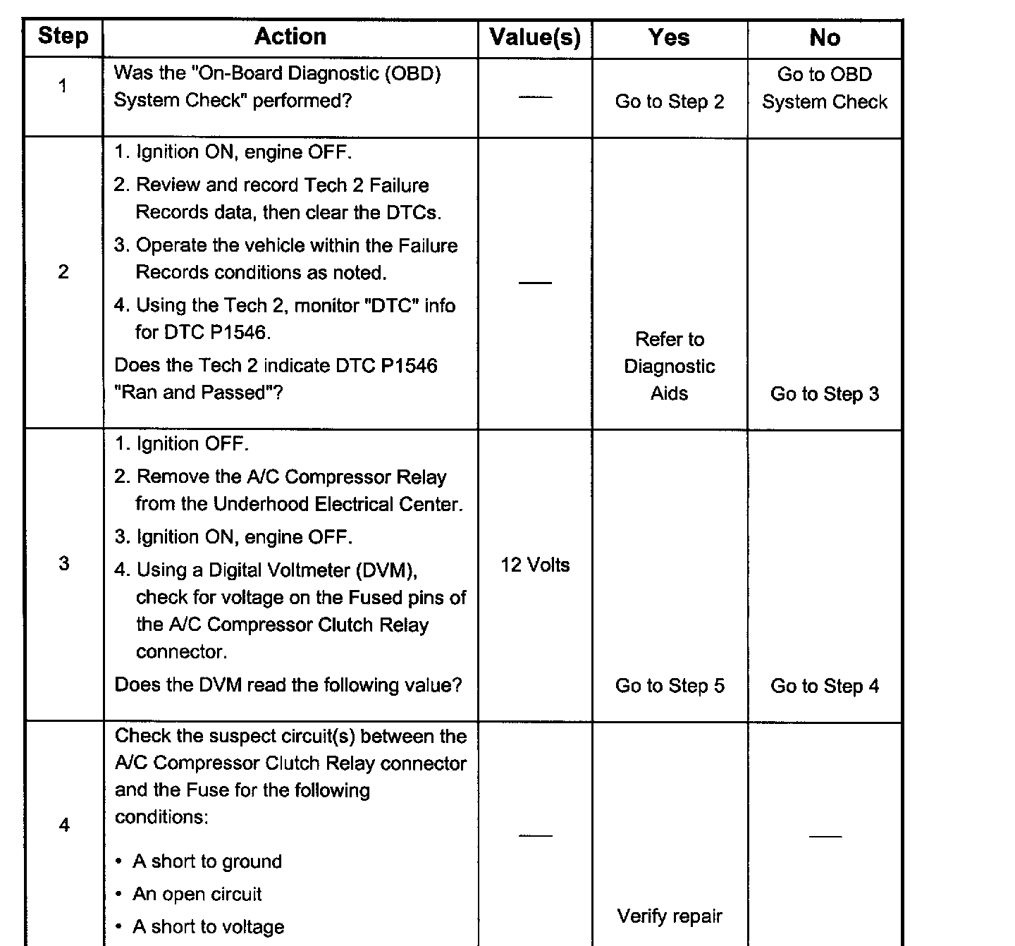 This chart should be used for diagnosing the electrical portion of the A/C compressor clutch circuit. A Tech 2 will be used in diagnosing the system. The Tech 2 has the ability to read the A/C request input to the PCM. The Tech 2 can display when the PCM has commended the A/C clutch ON. The Tech 2 should have the ability to override the A/C request signal and energize the A/C compressor relay.