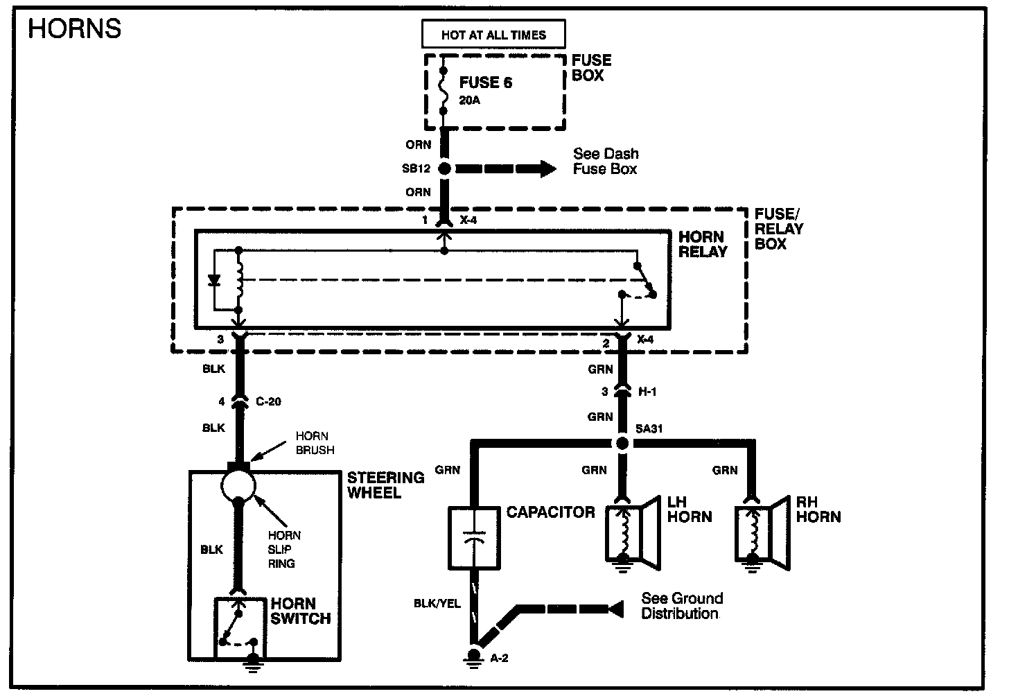 Voltage is applied to the horn relay at all times. When the relay coil is grounded by closing the horn switch, the relay contacts close. When the relay contacts are closed, both the LH and RH horns are energized.