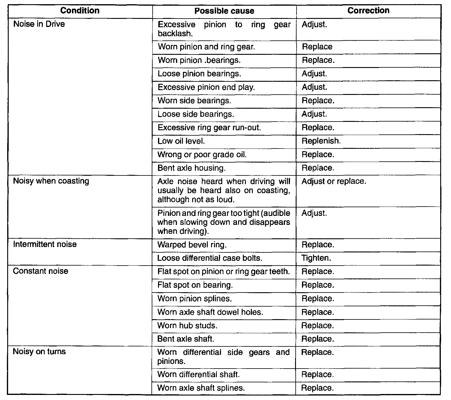 DIAGNOSISMany noises that seem to come from the rear axle actually originate from other sources such as tires, road surface, wheel bearings, engine, transmission, muffler, or body drumming. Investigate to find the source of the noise before disassembling the rear axle. Rear axles, like any other mechanical device, are not absolutely quiet but should be considered quiet unless some abnormal noise is present.