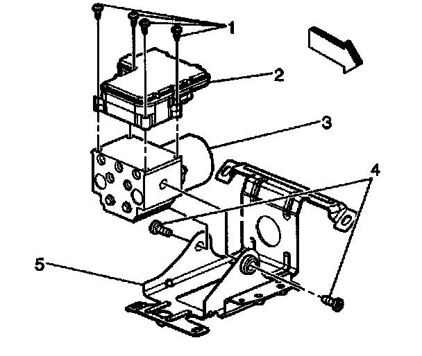 2. Remove the four T 25 Torx (R) mounting screws (1) that fasten the EBCM (2) to the BPMV (3)