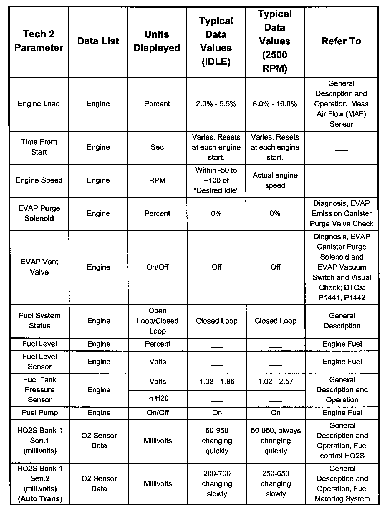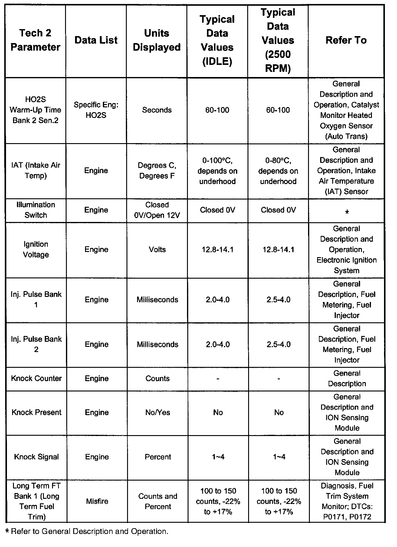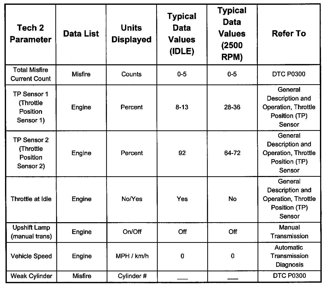 Only the parameters listed below are referred to for use in diagnosis. For further information on using the Tech 2 to diagnose the PCM and related sensors, refer to the applicable listed below. If all values are within the typical range described below, refer to Diagnosis by Symptom.