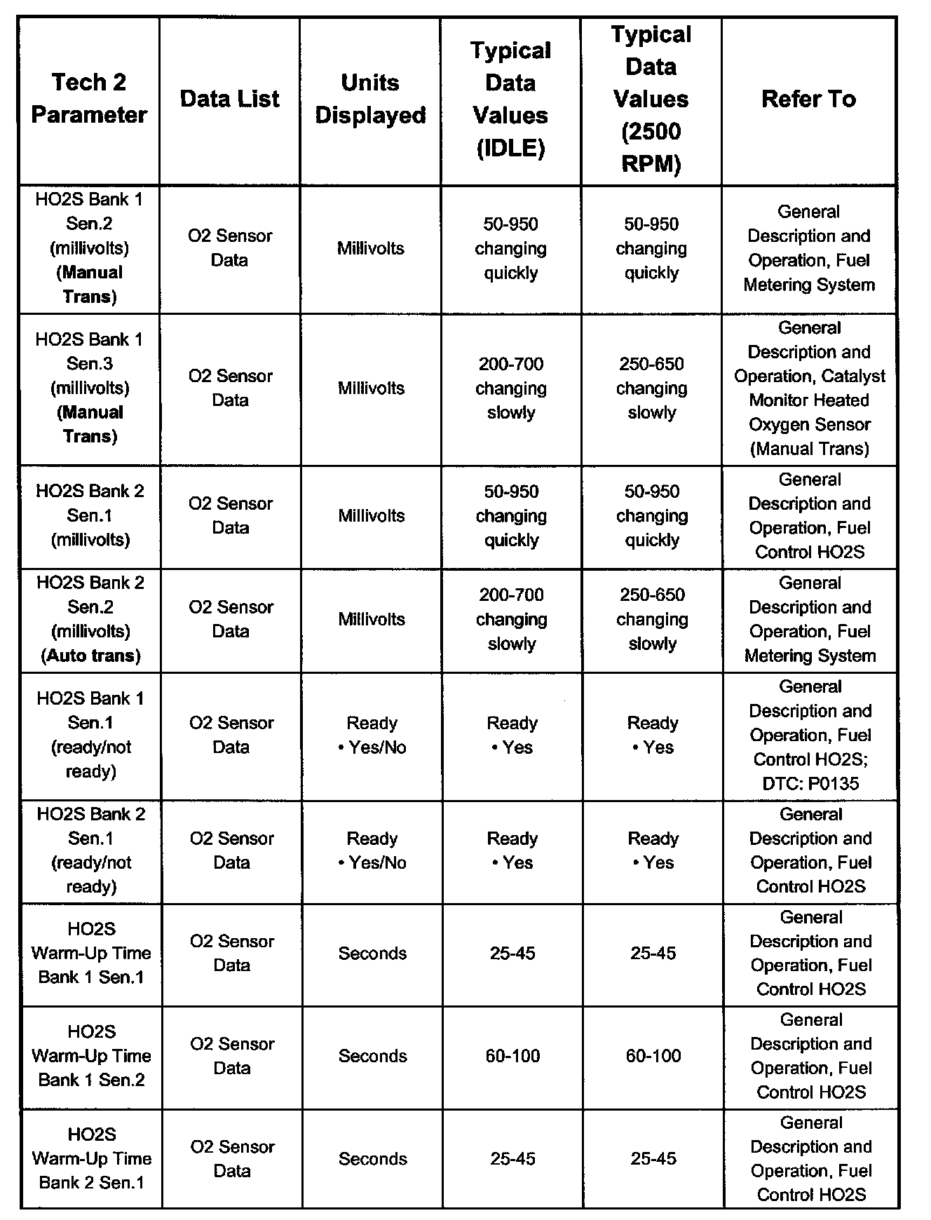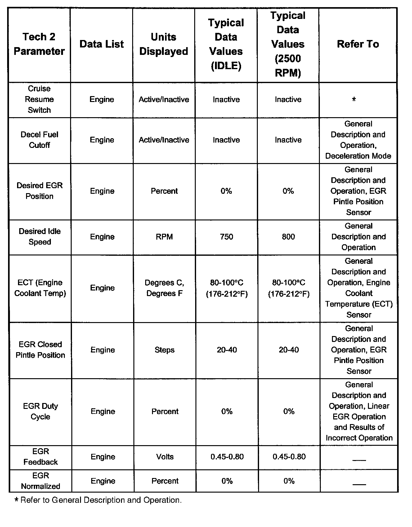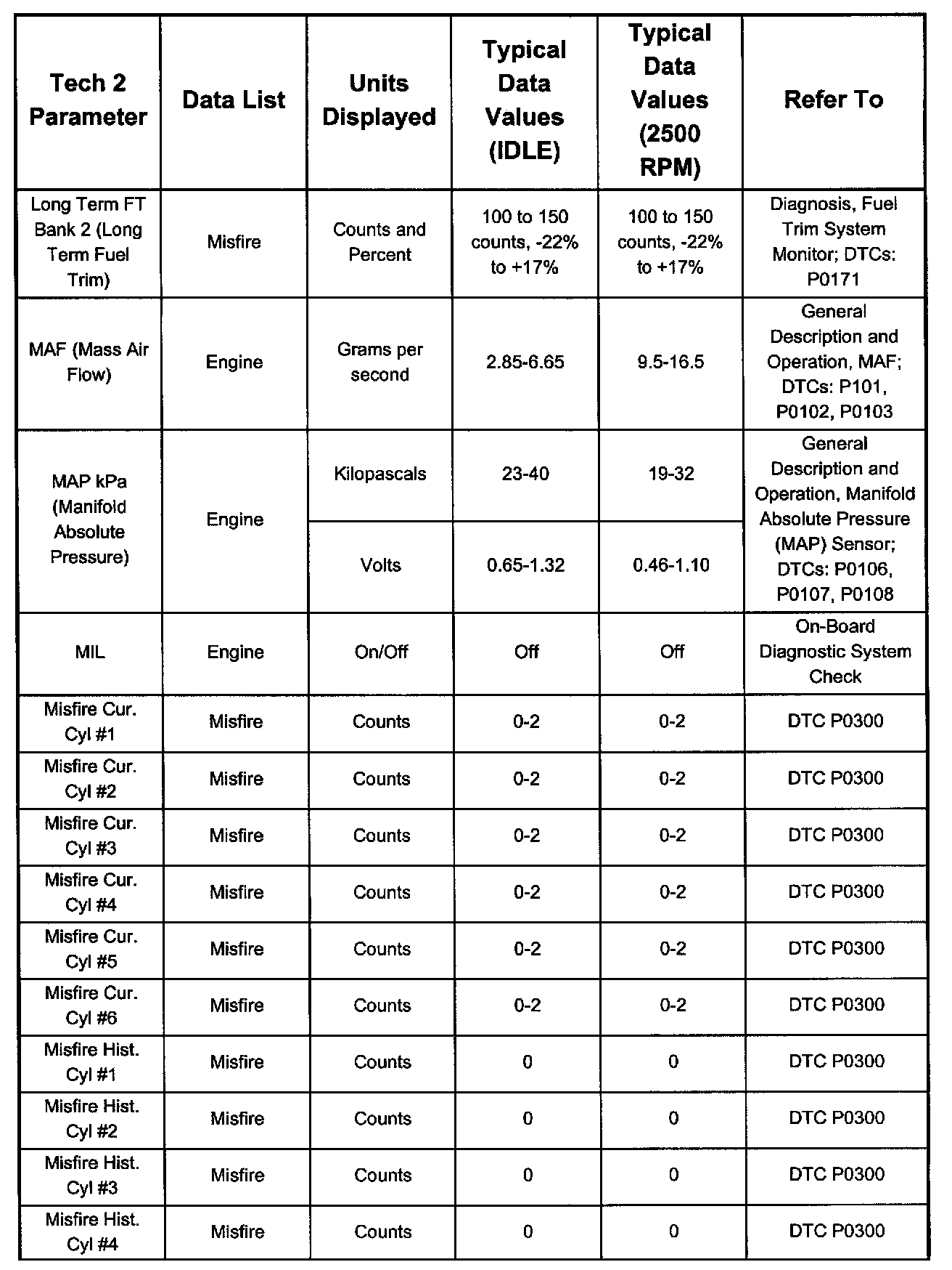 Only the parameters listed below are referred to for use in diagnosis. For further information on using the Tech 2 to diagnose the PCM and related sensors, refer to the applicable listed below. If all values are within the typical range described below, refer to Diagnosis by Symptom.