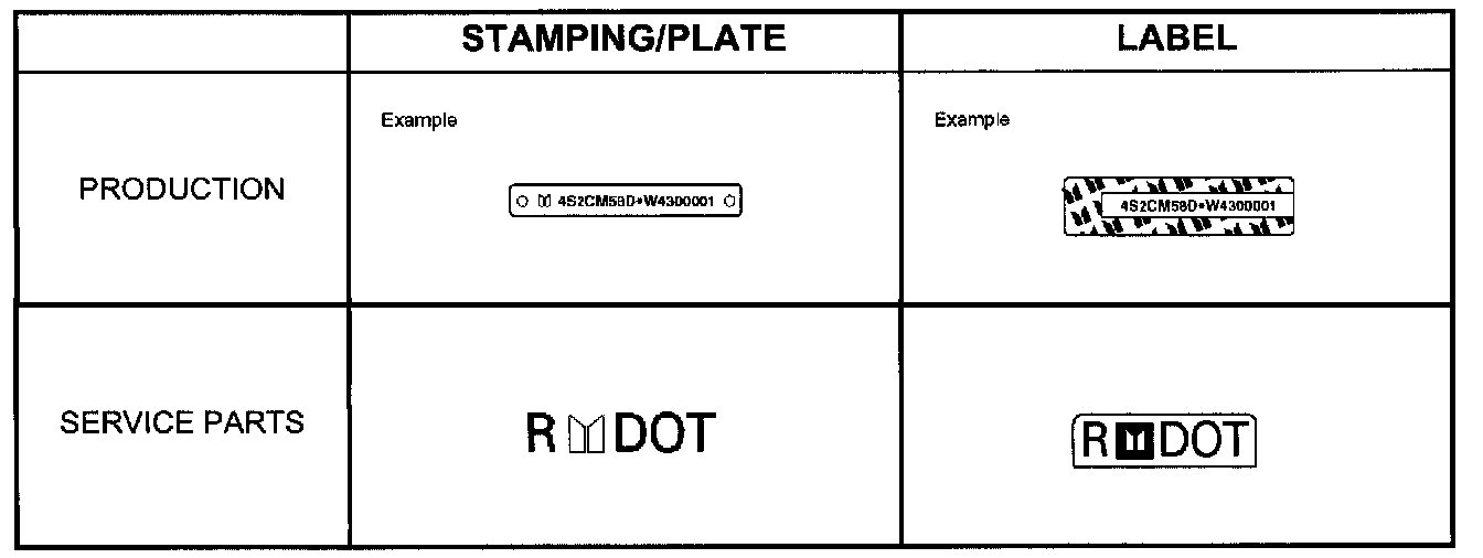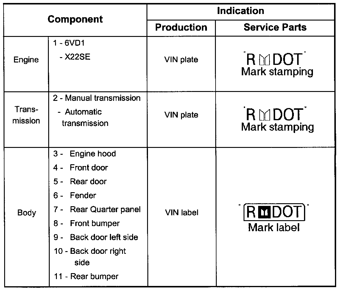 The 11 major components listed below will be marked with 17 digit VIN at the stage of production. In addition its service parts will be marked with manufacturer's trade mark, "R" mark and "DOT" mark.